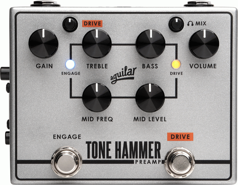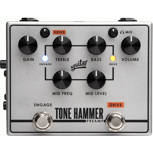 The new Aguilar Tone Hammer Preamp features the same iconic TH circuitry in a lighter, compact design, with added Headphone out, Aux In, newly designed Drive control (foot switch enabled), and fresh aesthetics to complement the Aguilar Tone Hammer 500/700 V2.