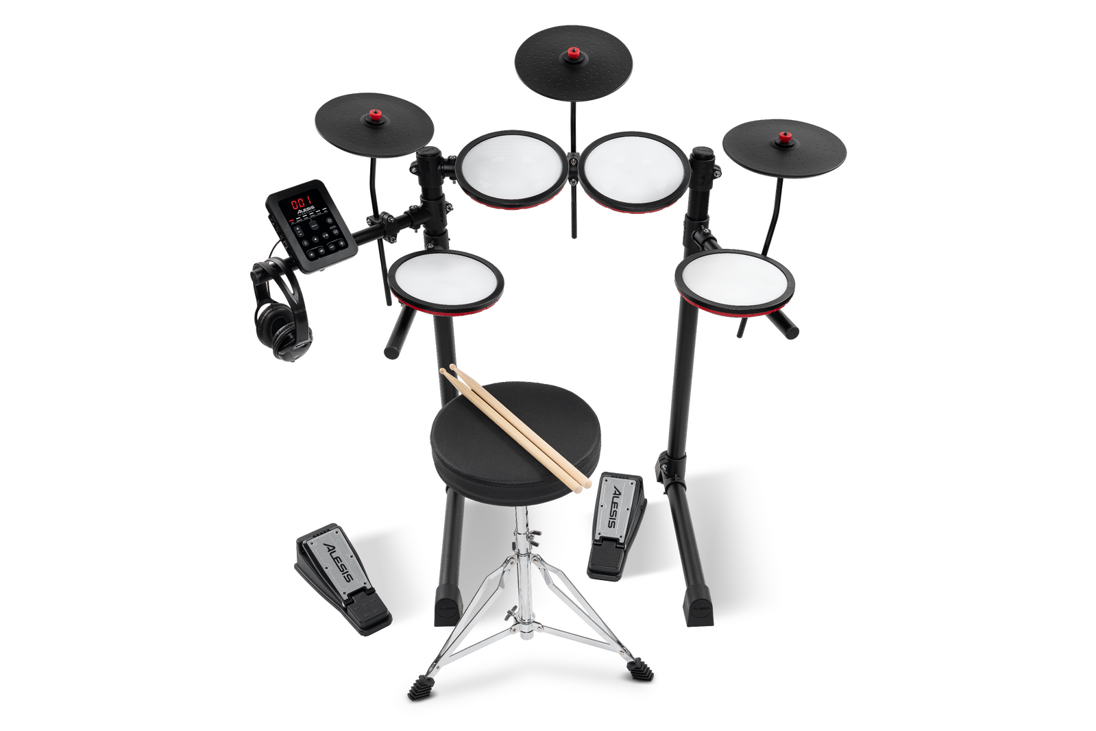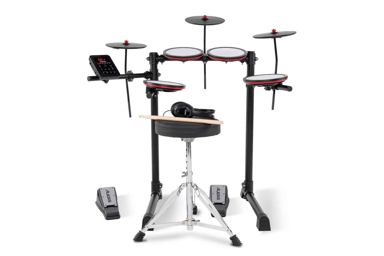 From the moment you unbox your Alesis Turbo Max, you’ll have a complete drum setup from kit to accessories. This electronic drum set includes four mesh drumheads, three cymbals, full-size kick and hi-hat pedals, a full-height adjustable rack, a drum throne, over-ear headphones, sticks, and the Turbo Max Drum Module with built-in sounds and kits.