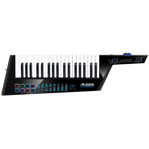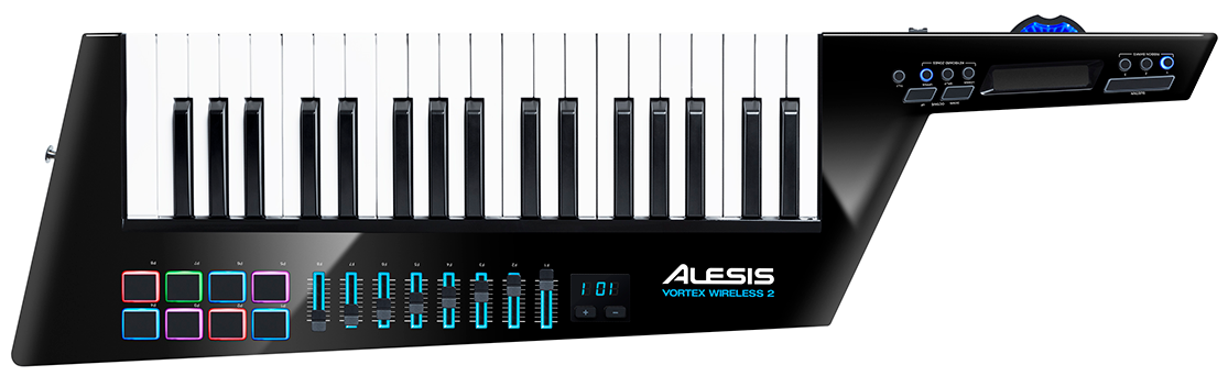 Take back the stage and experience untethered keytar performance with the next generation Alesis Vortex Wireless 2. Featuring improved ergonomics for better playability, a more durable housing, and an updated control layout, the updated Vortex Wireless 2 offers comprehensive MIDI controller functionality in a stylish and stage-ready keytar design with a stunning gloss-black finish. This dynamic MIDI keytar controller connects wirelessly to your computer and easily integrates with popular virtual instruments, plugins, and DAWs. For maximum stage and studio mobility, the PC- and Mac-compatible USB dongle uses a single USB port to establish a reliable, wireless connection. Create dynamic, expressive performances that the audience will both see and hear.