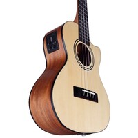 All Alvarez ukes are constructed with a dovetail neck joint for optimal strength and transfer of energy between the neck and body. The bracing design is a modification on traditional fan style braces to optimize response. The response is also aided by a solid “slotted” rosewood bridge, which enhances projection and helps to make string changes easier and quicker. The RU26TCE is fitted with a AUE 20 EQ and tuner.