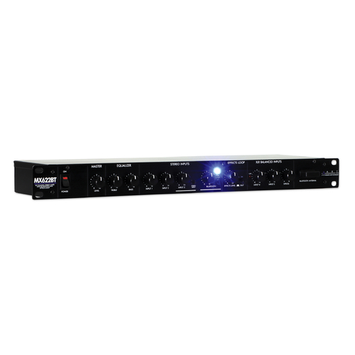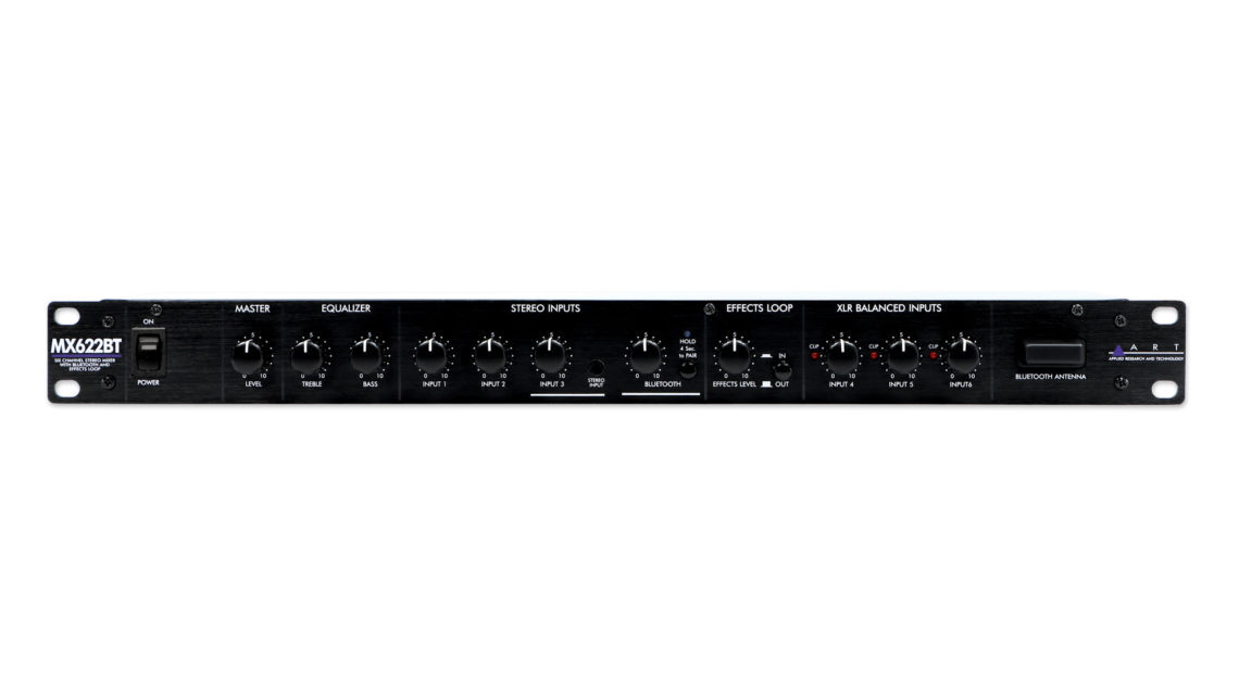 The ART MX622BT Six Channel Stereo Mixer with BLUETOOTH and Effects Loop is a versatile single high rack mixer combining three balanced microphone or line level inputs with three stereo line inputs plus a stereo Bluetooth input into a single stereo line level mix. Each mono balanced XLR input includes fully variable Input gain, Mic/Line switch, Clip indicator, and selectable 15 Volt Phantom power. Three stereo line level inputs are also provided via RCA type jacks with separate Level controls for each stereo pair. The front panel also has a 1/8-inch input for portable audio device input. The Bluetooth input supports Bluetooth 5.0 and has its own level control and Pairing/ ON/OFF switch. An external effects loop section provides a mono Send from the three Mic/Line channels to external equipment and stereo Returns with Effects Level and In/Out switch. Stereo Record output RCA jacks provide full-level signal of the entire mix at all times. Main outputs are stereo balanced 1/4-inch TRS with Master Level and full range Bass/Treble equalization. The built-in power supply and single high 19-inch rack mount format allows for easy installation and reliable operation.