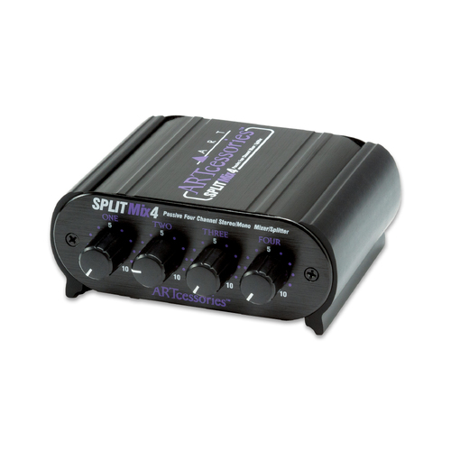 The SPLITMix4 is a fully passive hybrid mixer that offers a wide variety of configurations. Mix 4 stereo input channels down to 1 stereo output, split a stereo input signal to distribute 4 stereo output channels, or combine the configurations for a wide range of applications. You can even configure the SPLITMix4 as 4 stereo input channels thru 4 independent level attenuators to 4 stereo output channels.