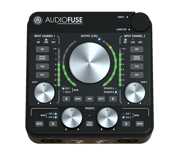 With AudioFuse, we didn’t want to settle for merely bringing you the sound quality of a pro studio, we wanted to bring you its workflow too. That’s why you have detailed metering, talkback for instant communication with talent in the next room, inserts to add professional effects processing to your recording chain, A/B monitor switching, and direct access to the essential features so you can spend more time creating and less time setting up.