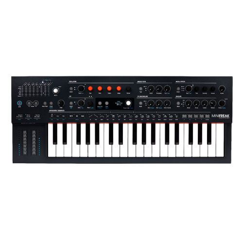 MiniFreak is a 6-voice polyphonic hybrid keyboard that fuses two digital sound engines with analog filters, outside-the-box sequencing, and instant-access modulation in a playful, curious, and sometimes unpredictable way. MiniFreak encourages users to escape the ordinary and explore the unconventional with a 37-note velocity-sensitive keybed with aftertouch, weave intricate evolving performances with multiple modulation lanes, and discover endless sweet spots with a built-in digital FX engine - a wildly creative experience.
