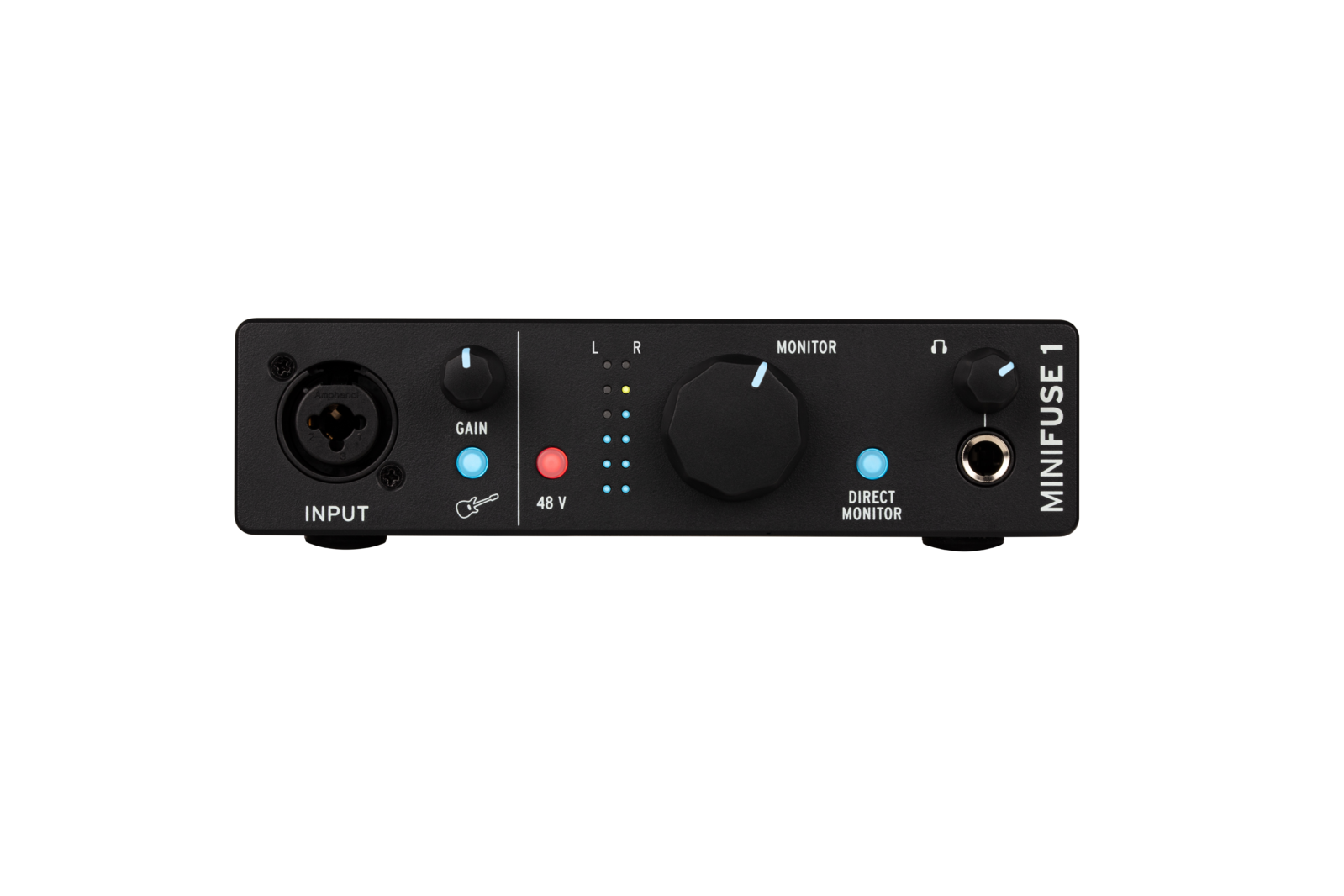 - Backlit controls: MiniFuse’s knobs light up in response to your input, turning red when the signal is too high