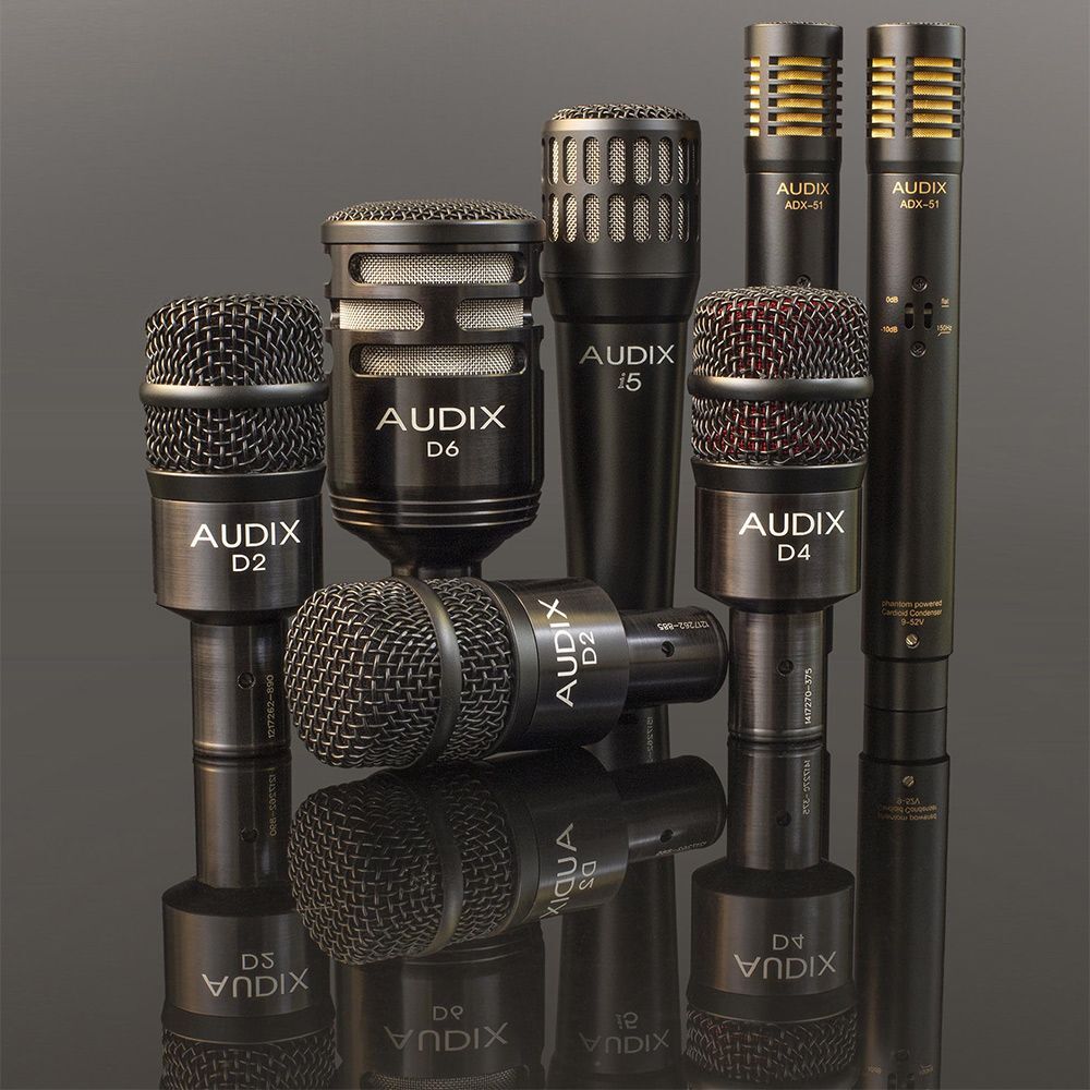 Included in the DP7 drum microphone package is the D6, Audix’s flagship kick drum microphone, two – D2 dynamic drum microphones for rack toms, one D4 for floor tom, the i5 for snare, and a pair of ADX51 studio condenser microphones for overhead miking. Also included are four D-Vice rim mount clips for the snare and tom microphones, and three heavy-duty tension fit microphone clips for the other three microphones. Everything is conveniently packaged in a foam-lined aluminum road case for safekeeping when the microphones are not in use.