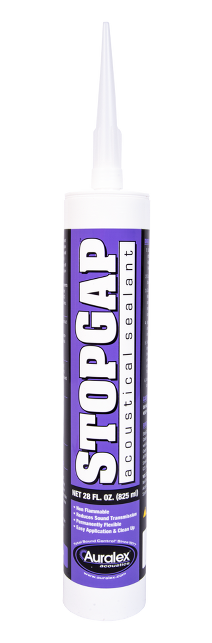 Auralex® StopGap™ will achieve a Sound Transmission Class (STC) of 53 when applying it in accordance with ASTM C-919 “Standard Practice for use of Sealants in Acoustical Applications”. To achieve the 53 STC, StopGap™ should be applied as two beads of sealant at the top, bottom and all perimeter edges.