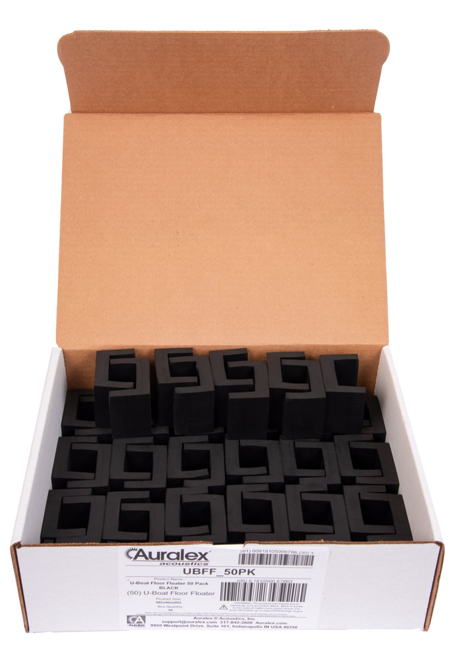 Made of a specially-formulated rubber compound, U-Boat™ Floor Floaters are our proprietary U-shaped channels used to support framing members and float (isolate and decouple) them from the surrounding structure. With the help of U-Boats™, a floated room features greatly improved transmission loss (isolation) and low frequency definition (translated: a tight, floated room will always sound better!).