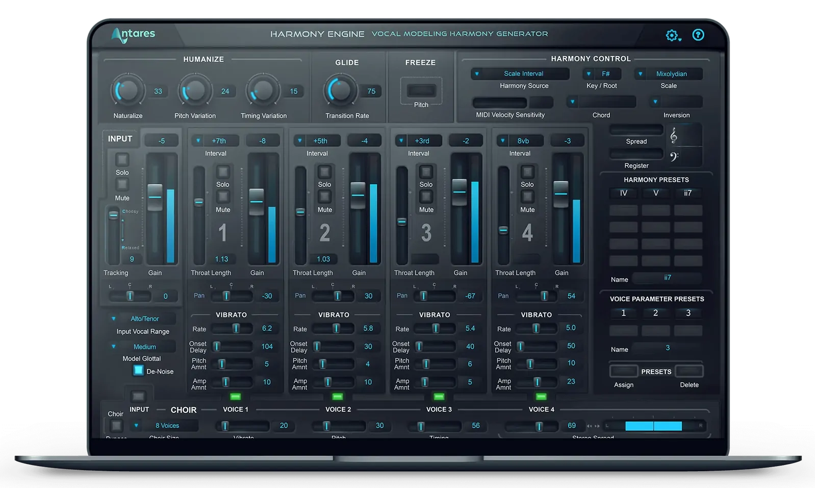 Four high-quality Harmony Voices with independently adjustable vocal timbre, vibrato, and pan settings