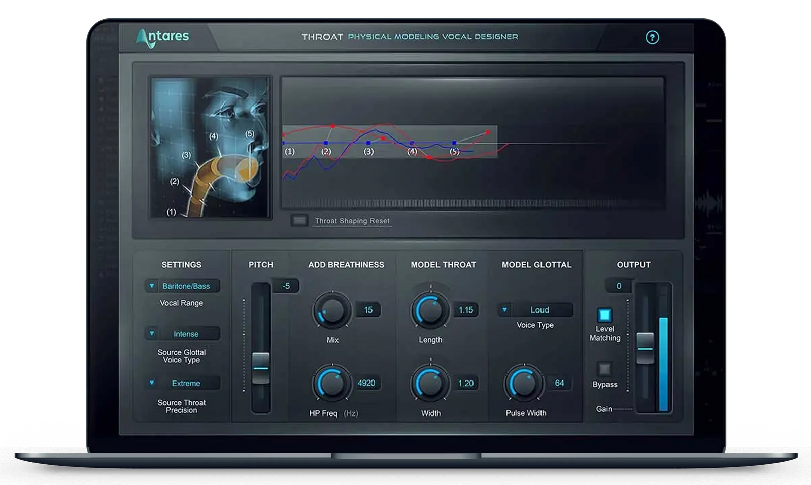 Graphic Throat Shaping Display lets you individually adjust the position and width of five points in the vocal tract model, from the vocal cords, through the throat, mouth, and lips.