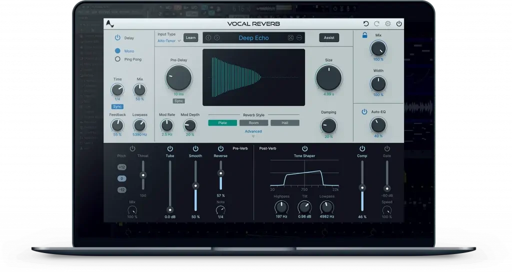 Vocal Reverb is the first vocal reverb plug-in to use powerful AI assist technology. It features Auto EQ to automatically remove mud from the reverb tail, three reverb algorithms, ten pre/post-effects, and two delay types.