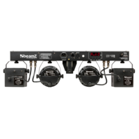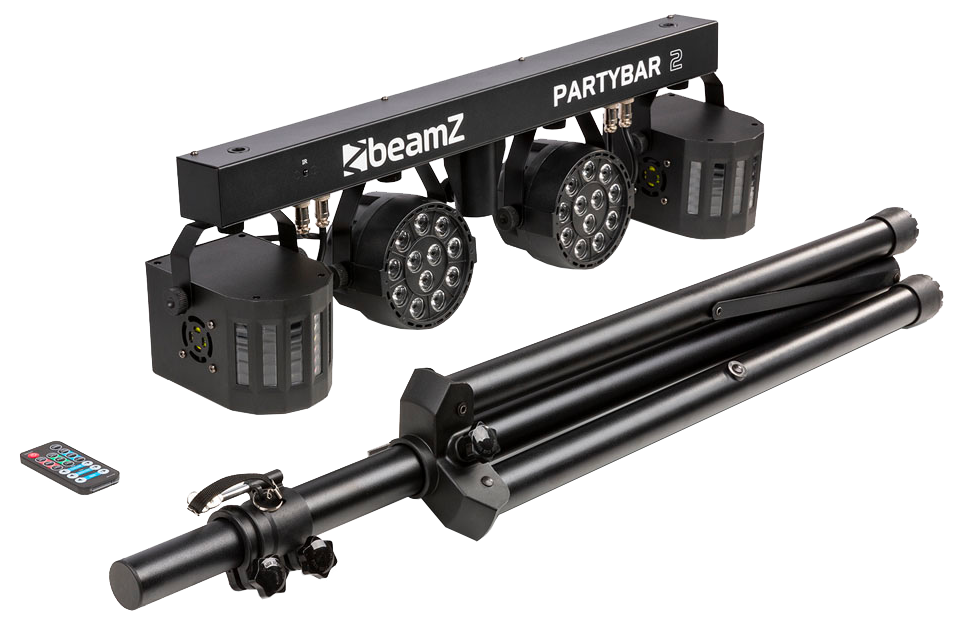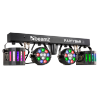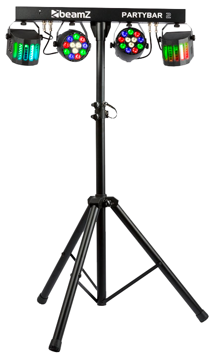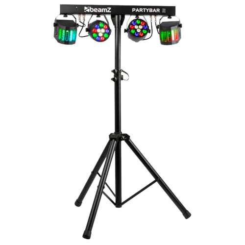 The Partybar 2 is a complete DJ lighting solution fitted with 2 PAR Cans with high-intensity RGBW LEDs and 2 Derby lights. This Partybar2 can be controlled via DMX, IR remote control or auto and sound-activated programs selectable from the control panel. A tripod stand is included for quick and easy setup. Specially designed for stages, parties, entertainers and all other special events.