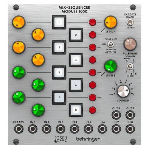 The MIX-SEQUENCER MODULE 1050 is a classic 8-channel mixer/sequencer. The 1050 allows you to rapidly select waveforms and signals via a conventional mixer format. Each audio input comes with its own attenuator knob and channel on/off buttons which you can use to mix and/or gate an input. Controlling and altering a sequence on the fly has never been so easy! The attenuator knobs are even color-coded into two groups of four channels which are tied to their respective master gain control. You can use the 1050 as an 8-input mixer with two adjustable outputs or as two separate 4-input mixers. When using the 1050 as a sequencer you can select between a single 8 step sequencer or a dual 4 step sequencers for ultimate flexibility.