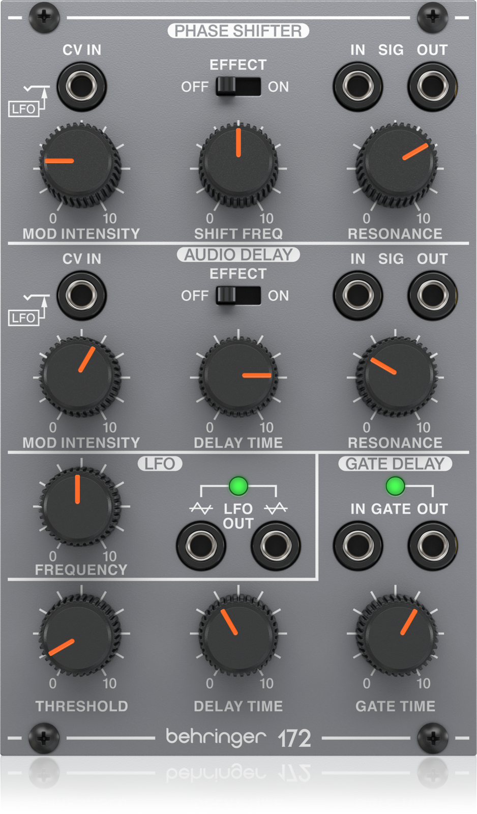 This is the Behringer SYSTEM 100 172 PHASE SHIFTER/DELAY/LFO. An authentic reproduction of the original “System 100M” circuitry from the 80s that can fit in a standard Eurorack case.