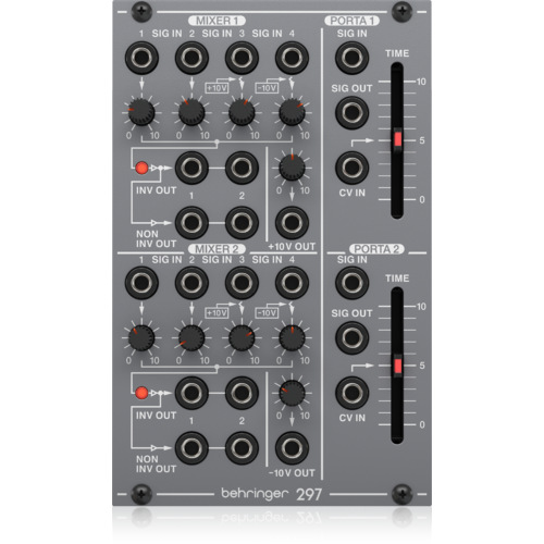 This is the Behringer System 100 297 DUAL PORTAMENTO/CV UTILITIES Module. A portamento and mixer combo and authentic reproduction of the original “System 100M” circuitry from the 80s that can fit in a standard Eurorack case.