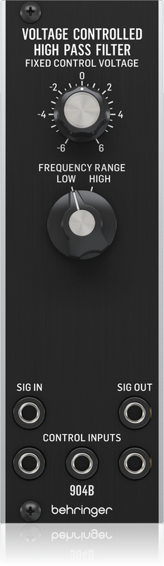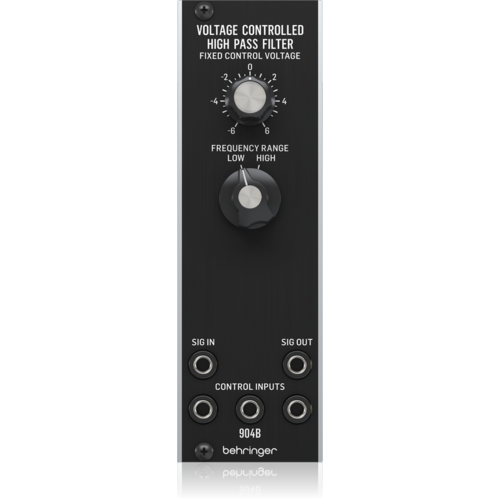 The 904B VOLTAGE CONTROLLED HIGH PASS FILTER allows you to attenuate low frequencies and accentuate higher ones in a signal. With the Fixed Control Voltage knob, also known as a cutoff frequency, determines the frequencies attenuated below a certain point. Switch the Frequency Range between Low (4 Hz to 20 kHz) or High (10Hz to 50 kHz) to select what frequencies the Fixed Control Voltage affects. You can use the 904B to let you cut through a mix for some searing lead tones or pair it with the Behringer 904A VOLTAGE CONTRLLED LOW PASS FILTER and be prepared to hear some very interesting sounds.