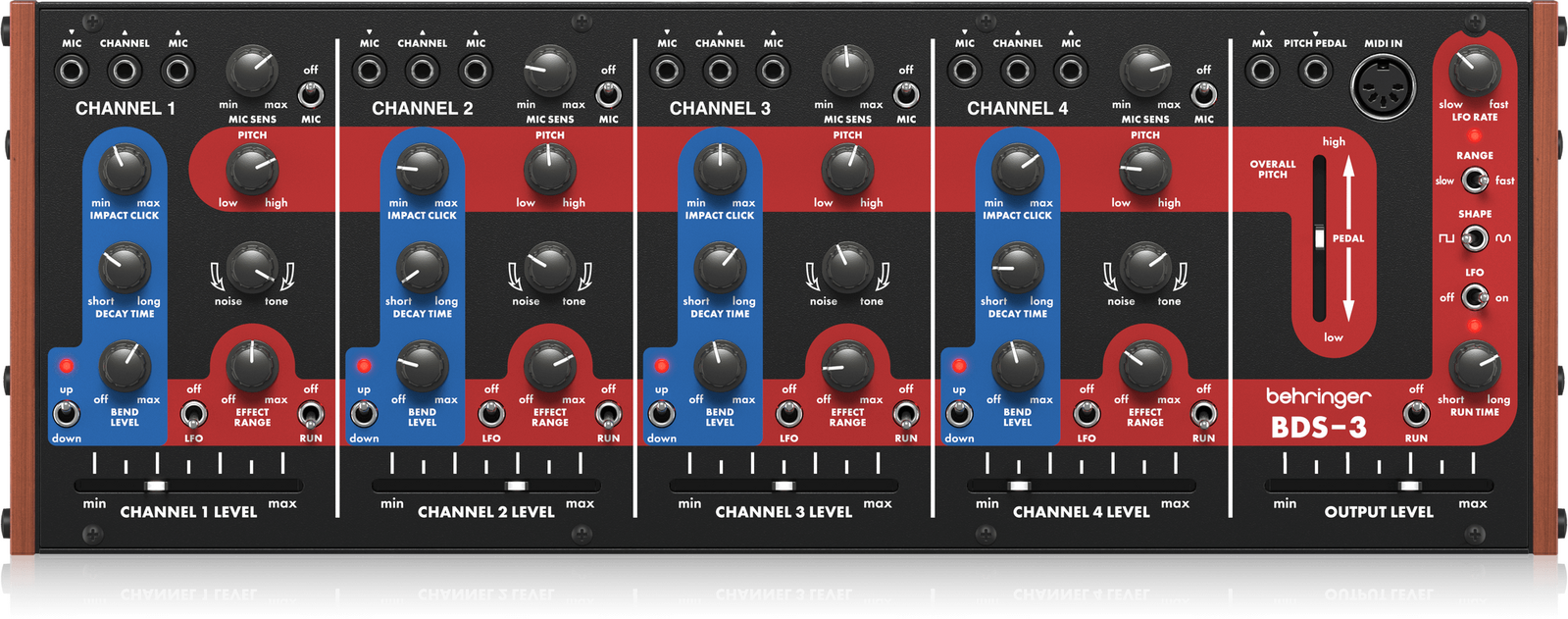 BDS-3 features 4 identical drum channels that have controls for adjusting different elements of a beat. You can add a click at the start of a sound (similar to a stick hitting a drum), adjust decay, bend a note up or down, change the pitch of a signal coming through as well as the range of LFO and effects from the Master/Effects section. The most fun way of triggering the channels is by mic-ing up a drum to each of the channels and just playing. The inputs are even velocity sensitive and responsive to your playing dynamics.