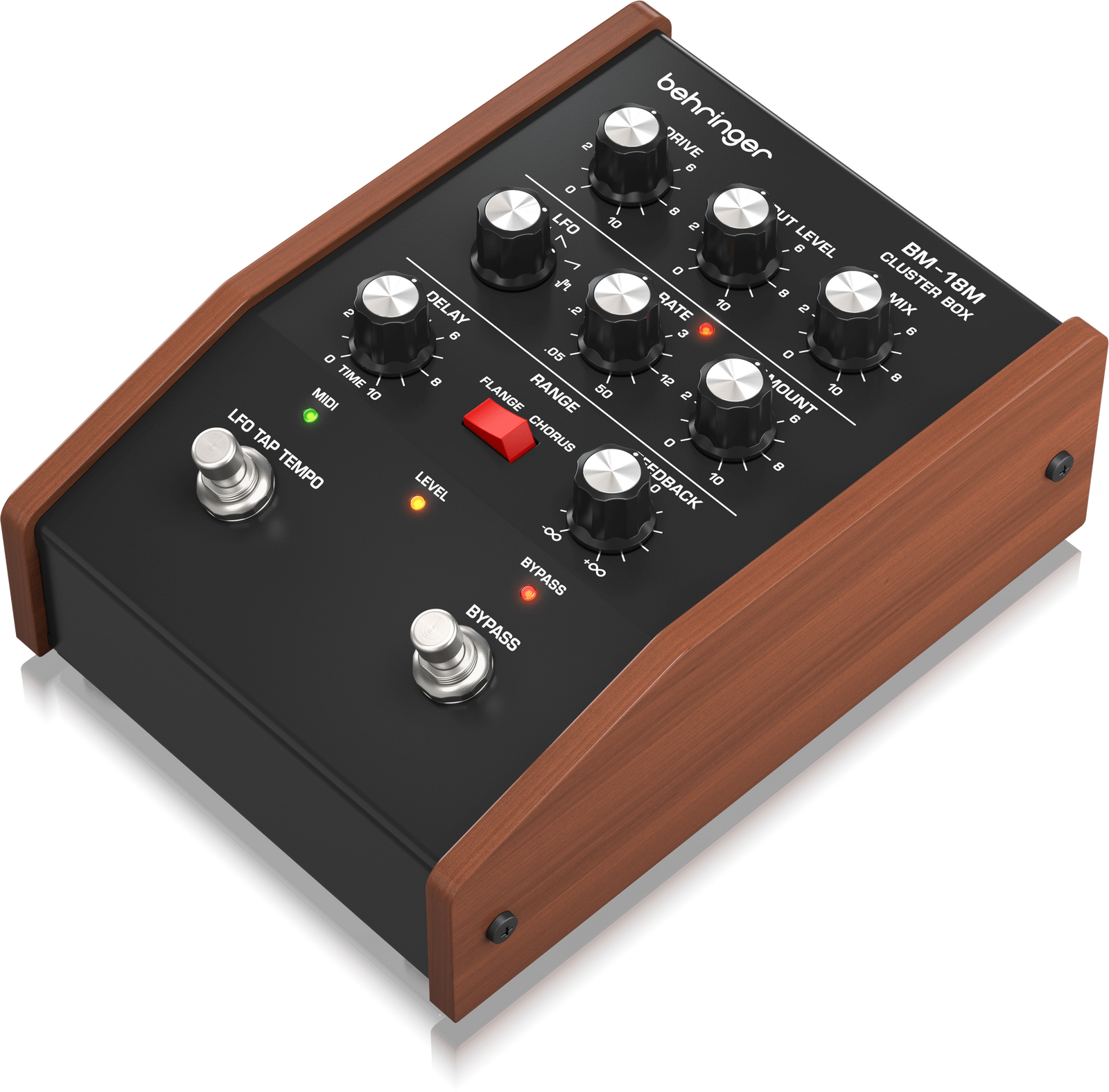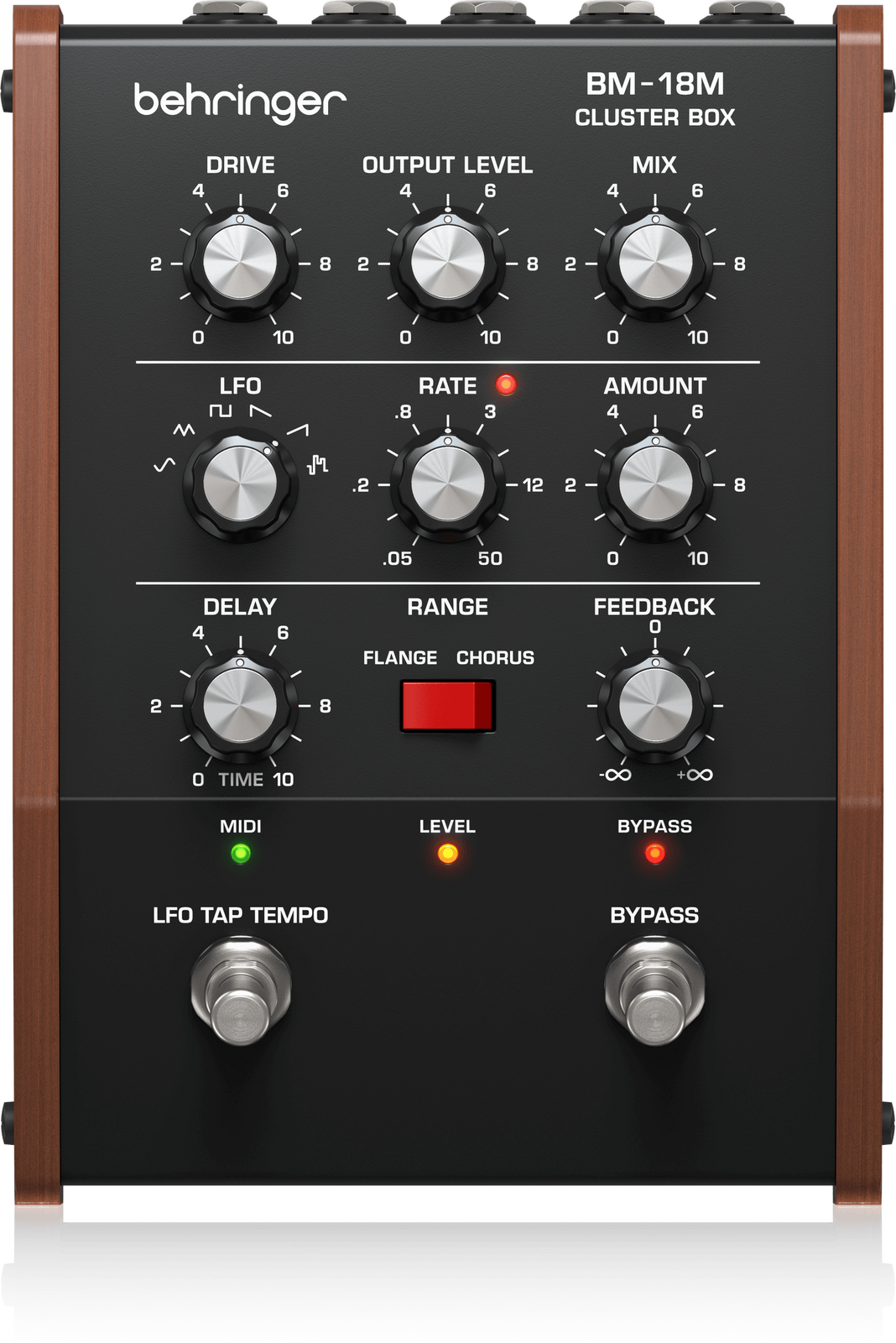 The Behringer BM-18M CLUSTER BOX is a modulation powerhouse that blends the warmth of classic chorus and flanger tones with a modern edge. At its core, a simple range rocker lets you switch between lush chorusing and sweeping flange textures—but the CLUSTER BOX is anything but basic. Whether you're chasing vintage shimmer or pushing into wild, unpredictable territory, this pedal is built to inspire.