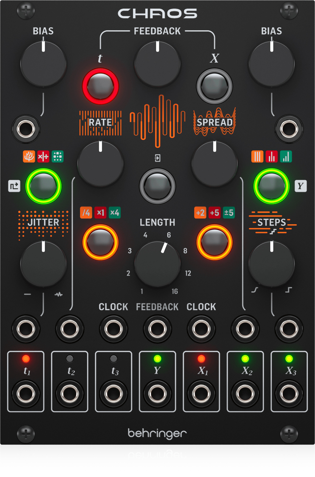 Create intricate melodies as well as complex beats and soundscapes with the Behringer CHAOS, an analog Eurorack module capable of random sampling. Control clock speeds, trigger and CV probability, scale length for some over-the-top melodies, ambient washes and grooves in an infinitely tweakable module.