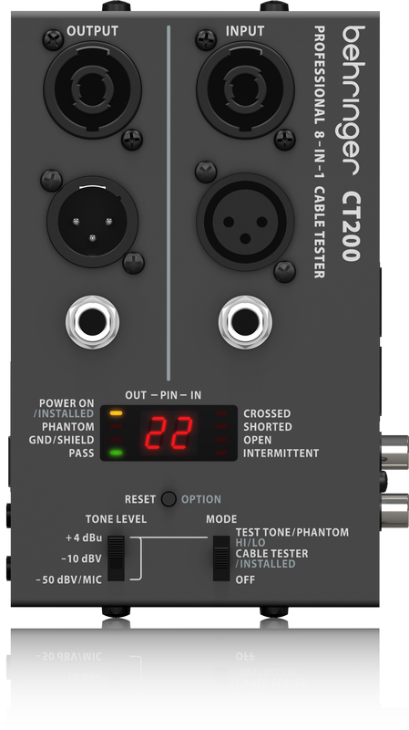 The CT200 accepts every type of cable you might use in a recording or live performance situation: XLR, Speakon*, TRS (¼", 1⁄8"), RCA, RJ45, MIDI and USB. Choose from 3 diagnostic modes: Cable Test, installed Cable Tester or Tone. The CT200 can check for continuity, intermittent or shorted connections, the presence of phantom power and grounded shields. Because this handy tool runs on two AA batteries, you can carry it in your pocket and be ready to troubleshoot at a moment’s notice.