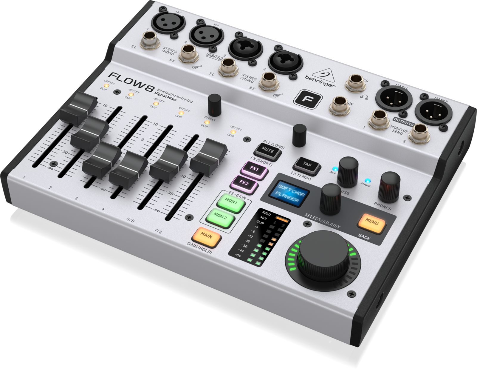 Gain staging is always a compromise and finding the right one requires either experience and technical knowledge, or the new FLOW 8 EZ-GAIN feature. The function can monitor signals on one or all channels at the same time, until you think the loudest sounds have been put to it. EZ GAIN will then automatically adjust the channel gain to the optimum headroom.