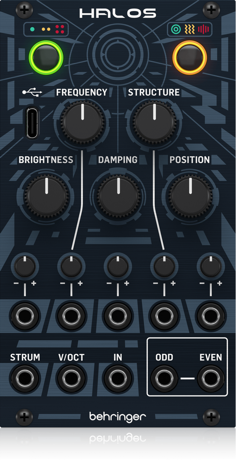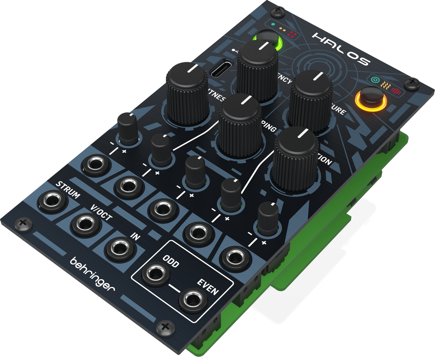 Whether you’re building a sequence or sculpting a soundscape, sometimes, a patch needs that earthy, organic resonance to feel complete. The Behringer HALOS delivers exactly that – an expressive resonator that breathes life into your modular system by turning simple inputs into evolving, acoustic-like textures. By modelling how real materials like string and plate resonate, HALOS adds rich natural character to any sound.