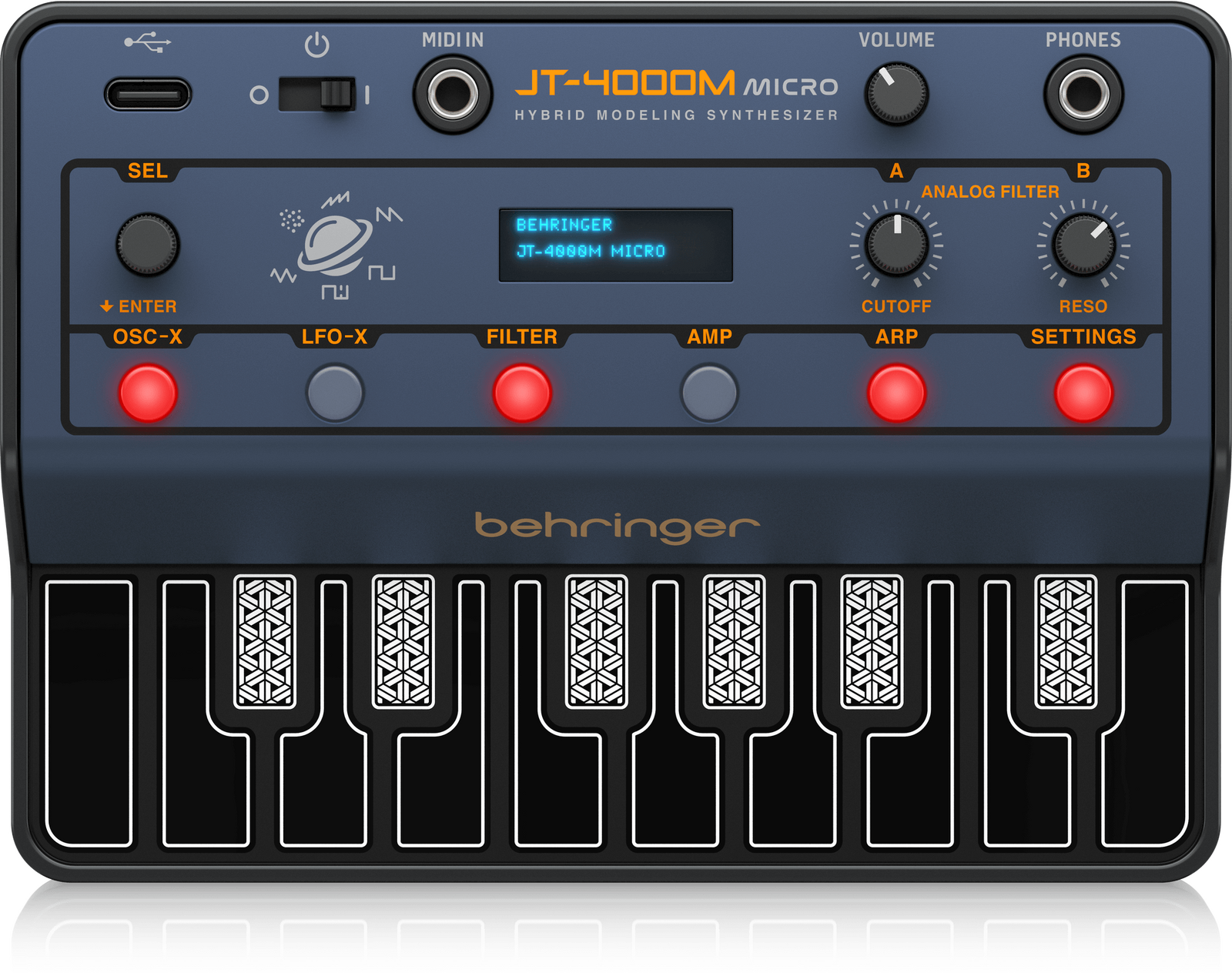 The JT-4000M MICRO is a reproduction of the JP-8k sound engine with a Supersaw waveform. But we decided to go a bit further than that and hit it with a shrink ray, 32 memory presets, MIDI over USB, plus many more features that make it an amazing and flexible synth that can fit any setup