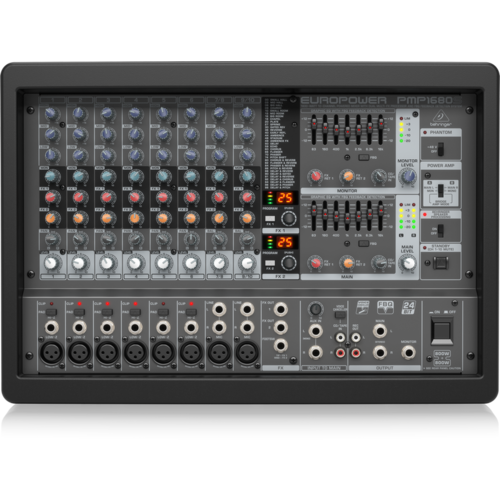 The amazing PMP1680S Powered Mixer packs tremendous power (2 x 800 Watts stereo or 1,600 Watts in Bridged mode), while maintaining an incredible power-to-weight ratio. These mixers employ high-efficiency Class-D technology and a state-of-the- art switch-mode power supply, which significantly reduces weight and heat. The 10-channel PMP1680S features 8 high-quality mic preamps, 2 stereo channels, dual 24-bit Multi-FX processors with 100 awesome presets including studio-class reverbs, delays, pitch shifter and various multi-effects, plus a 7-band stereo graphic EQ with our proprietary FBQ Feedback Detection System – for the ultimate in feedback-free performance.