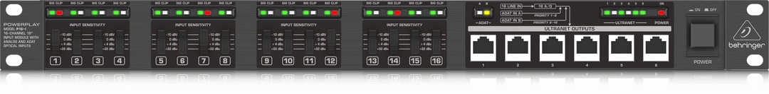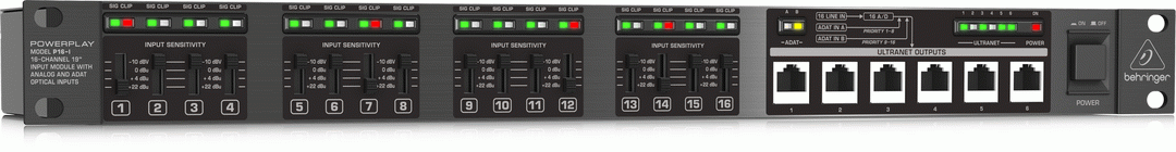 The POWERPLAY P16 system is the easy and affordable way to give live or recording musicians/vocalists what they really want – “more me!” Part of the P16 Personal Monitoring System, the P16-I input module can be used with any analog source, and convert up to 16 analog inputs into 24-bit digital audio to send to your P16-M Personal Monitoring Mixers. The P16-I is also equipped with ADAT optical inputs that auto-detect and give priority to incoming signals.