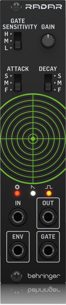 The pickup on the RADAR is even sensitive enough to capture any surrounding acoustic waves be it a knock on your modular case, a snare hit from your drummer or even sounds coming out of loudspeakers. Those sounds can then be converted into gate or envelope signals and tweaked with the Gate Sensitivity or Attack and Decay controls respectively.
