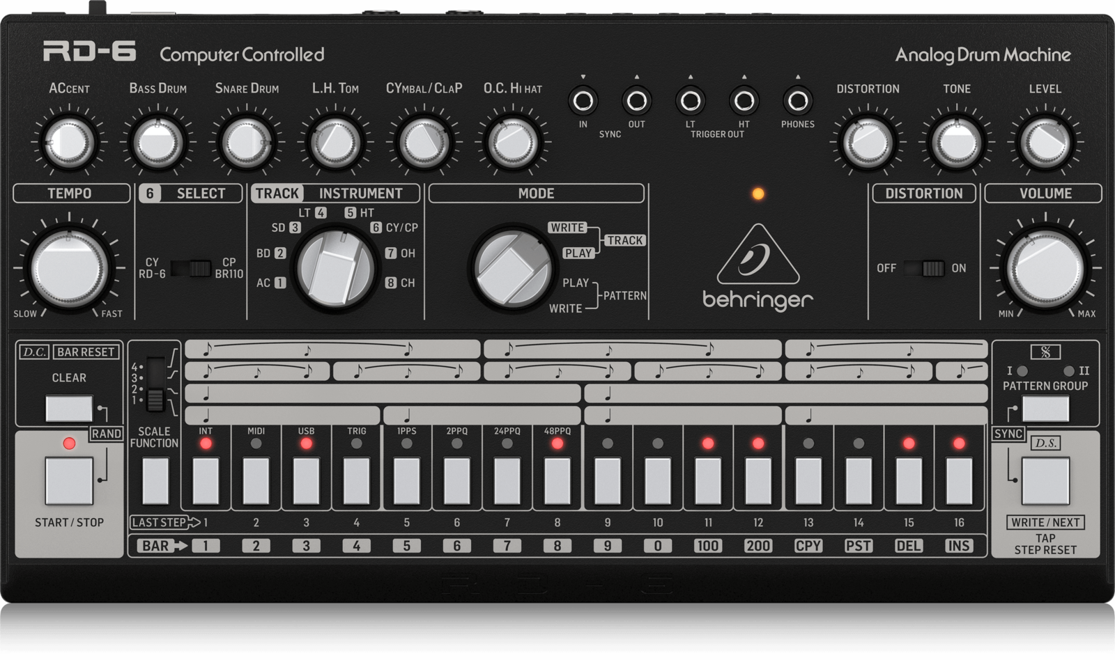 16 authentic-style step buttons with LED indicators for easy pattern creation
