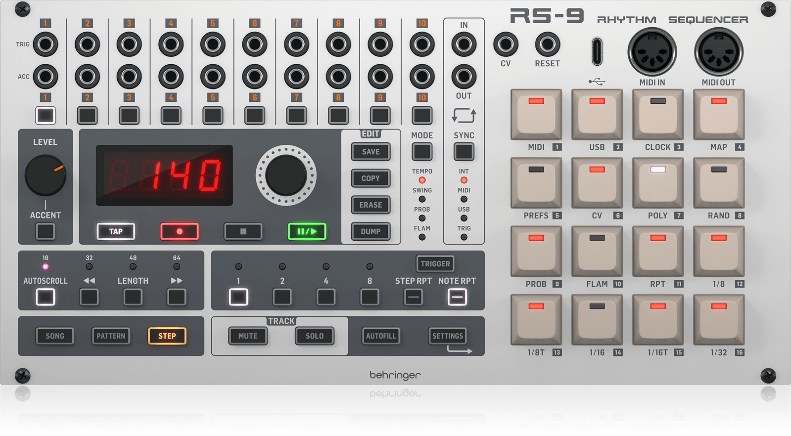 Become a master beat-maker with the Behringer RS-9! Great for making rhythms on the fly, RS-9 includes: 10 drum channels and a 64-step sequencer.