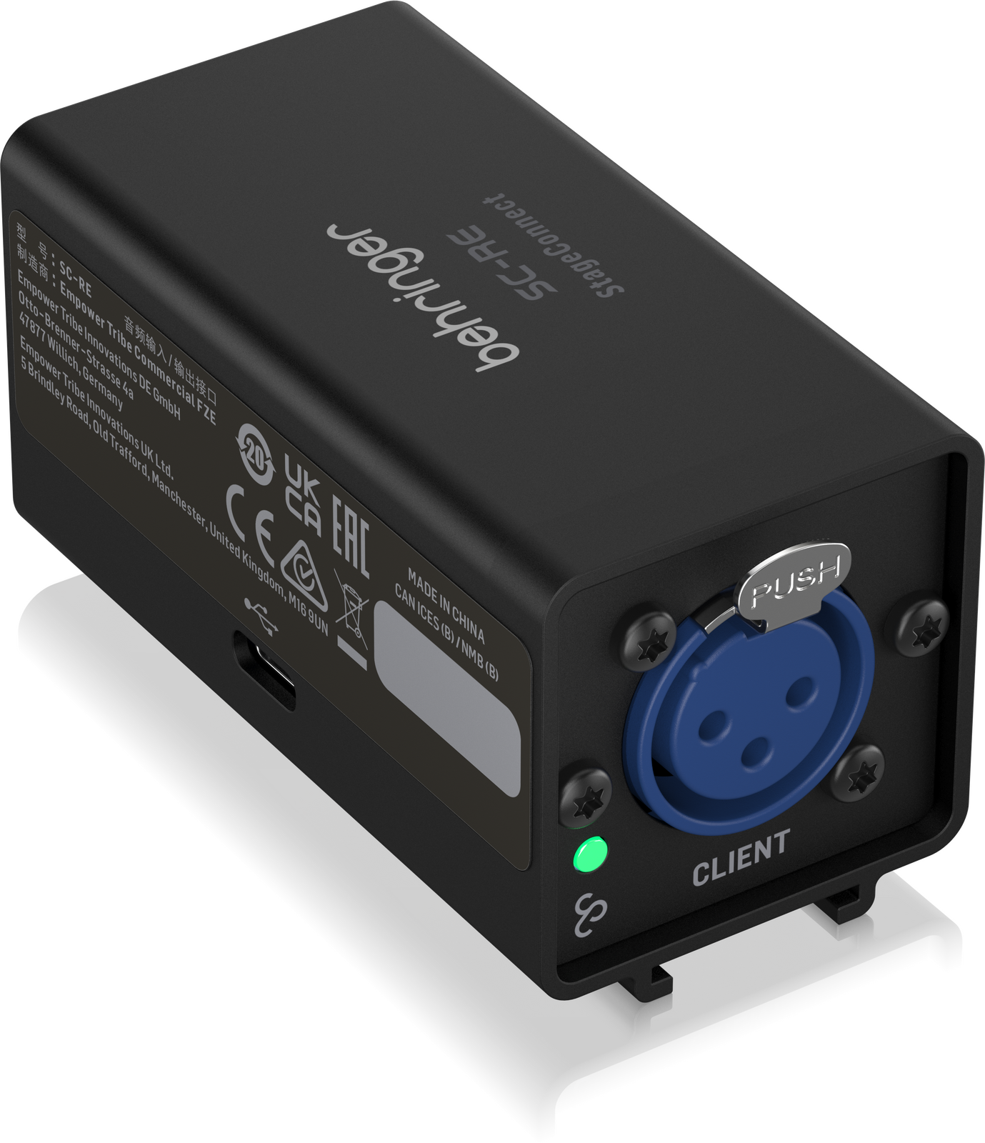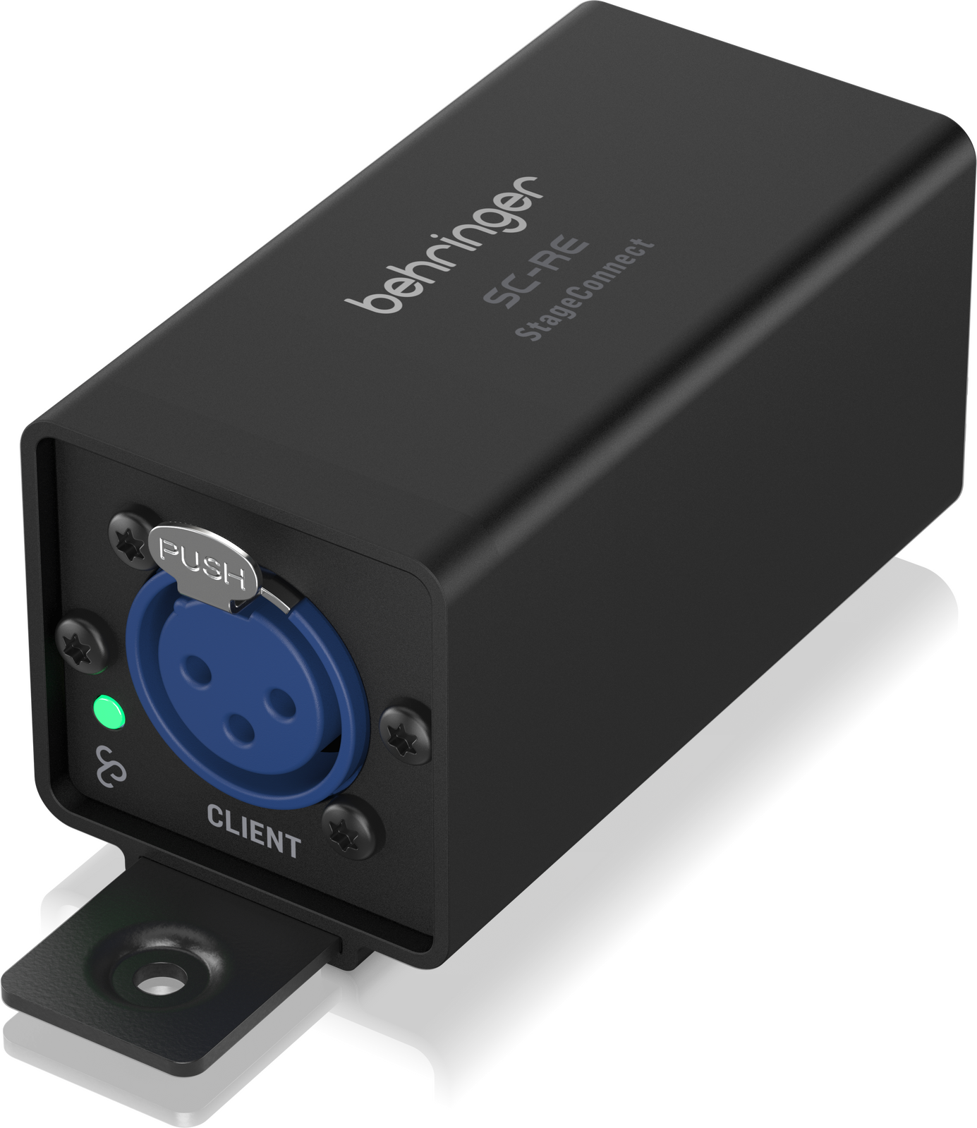 The Behringer SC‑RE StageConnect Range Extender is a compact and powerful solution for expanding your StageConnect setup, doubling the maximum transmission distance from 40 to 80 metres over standard XLR or DMX cable. Designed for professional touring and fixed installations, it supports bi‑directional transmission of up to 32 channels of pristine 24‑bit audio at 44.1/48 kHz with ultra‑low, sub‑millisecond latency. Audio, control data, and up to 12 VDC / 18 W of remote power are all carried over a single 3‑pin XLR connection, simplifying cabling and stage layouts. Housed in an ultra‑slim enclosure barely larger than two XLR connectors, the SC‑RE consumes just 0.5 W of power and includes a metal mounting bracket for easy integration into racks, touring cases, or permanent installations—making it a reliable and space‑saving tool for extending your StageConnect network.