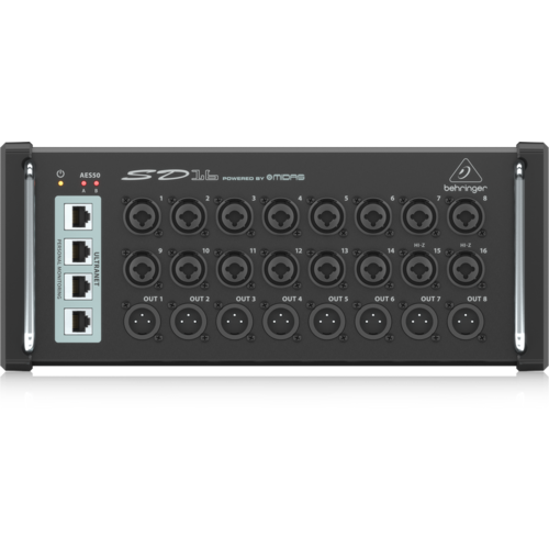 Digital mixing has revolutionized virtually everything in the live- entertainment production workflow. Now we’ve come up with the perfect solution for connecting the onstage talent with your Front of House (FOH) console, and the rest of the world – the ultra-cool and ultra- affordable SD16 Stage Box! The SD16 provides 16 MIDAS-designed remote- controllable mic preamps, 8 balanced analog XLR returns at the stage end, plus an integrated 4-port ULTRANET distribution hub for direct connection to our P16-M personal monitor mixers – without any additional hardware required. Plus, the SD16 is extremely compact and comes with rugged protective bumpers, so you can toss them directly on stage wherever you need them. The best part – all it takes is a single shielded CAT5e cable per stage box (up to 330 ft / 100 m length). And If you need more inputs, or just want to keep your cable runs short and tidy, putting an SD16 at stage front and another behind the drum riser gives you an additional 16 inputs for drum and guitar/bass amp mic’ing. When used as part of a complete X32 system, as many as three SD16 Stage Boxes can be cascaded via the built-in AES50 ports to provide up to 48 bidirectional inputs and 24 balanced XLR outputs. An onboard ULTRANET distribution hub provides power and 16 channels of audio to 4 BEHRINGER POWERPLAY P16-M personal monitor mixers per SD16, all via inexpensive shielded CAT5e cabling – and without any additional hardware. Two of the programmable inputs are also compatible with Hi-Z sources, so you can connect keyboards, acoustic and bass guitars, etc., with no DI box required. The SD16 also features a USB port for fast and easy system updates via your PC.