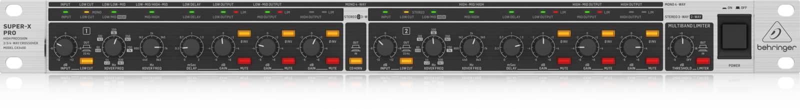 The CX3400 stereo 2-way/3-way/ mono 4-way crossover provides the ultimate in high-precision audio frequency separation, thanks to its state-of-the-art circuitry, superior-grade components, ultra low-noise op amps and balanced I/O connectivity. CX3400 features include: Limiters on all crossover outputs for optimal loudspeaker protection; an adjustable Time Delay for proper phase-alignment of the drivers; High-Frequency (HF) horn equalization for constant-directivity compensation; and a mono “Low Sum” Output (stereo modes only), which is ideal for your subwoofer applications. When a sound system is properly tuned, it becomes powerful, balanced and efficient. Bass content is punchy and tight, with vocals and instruments that are rich, crisp and well defined. The CX3400 crossover’s accurate signal processing protects critical loudspeaker components and improves overall system efficiency. All Input and Output connections are balanced/unbalanced XLR and feature 25 Hz Low Cut filters for low-frequency driver protection – plus off er Mute and Phase Invert switches, making troubleshooting even a large system – virtually effortless! Chances are if you’re reading this, you already know what a crossover is – and you know that you need one. But if you are new to multi-way PA systems, here's a brief overview. Loudspeakers (which we call transducers) convert electrical signals into sound waves. And no matter how well a transducer is designed or made, it simply cannot reproduce the entire audio spectrum all by itself. Low-frequency sounds tend to push a transducer to the maximum, making it impossible for that same transducer to reproduce the treble content with the sound quality it deserves. (Try singing high falsetto next time you’re bench-pressing your limit!) That's why high-quality sound systems use multiple speakers (woofers and tweeters) to spread out the work. While the woofer (usually the larger transducer) does all the heavy lifting, the tweeter can easily handle the high-frequency content. Three and four-way systems distribute the work even more, allowing the individual transducers to reproduce the frequency range for which they were designed. It is the crossover’s function to divide these tasks between the various amplifiers and transducers.
