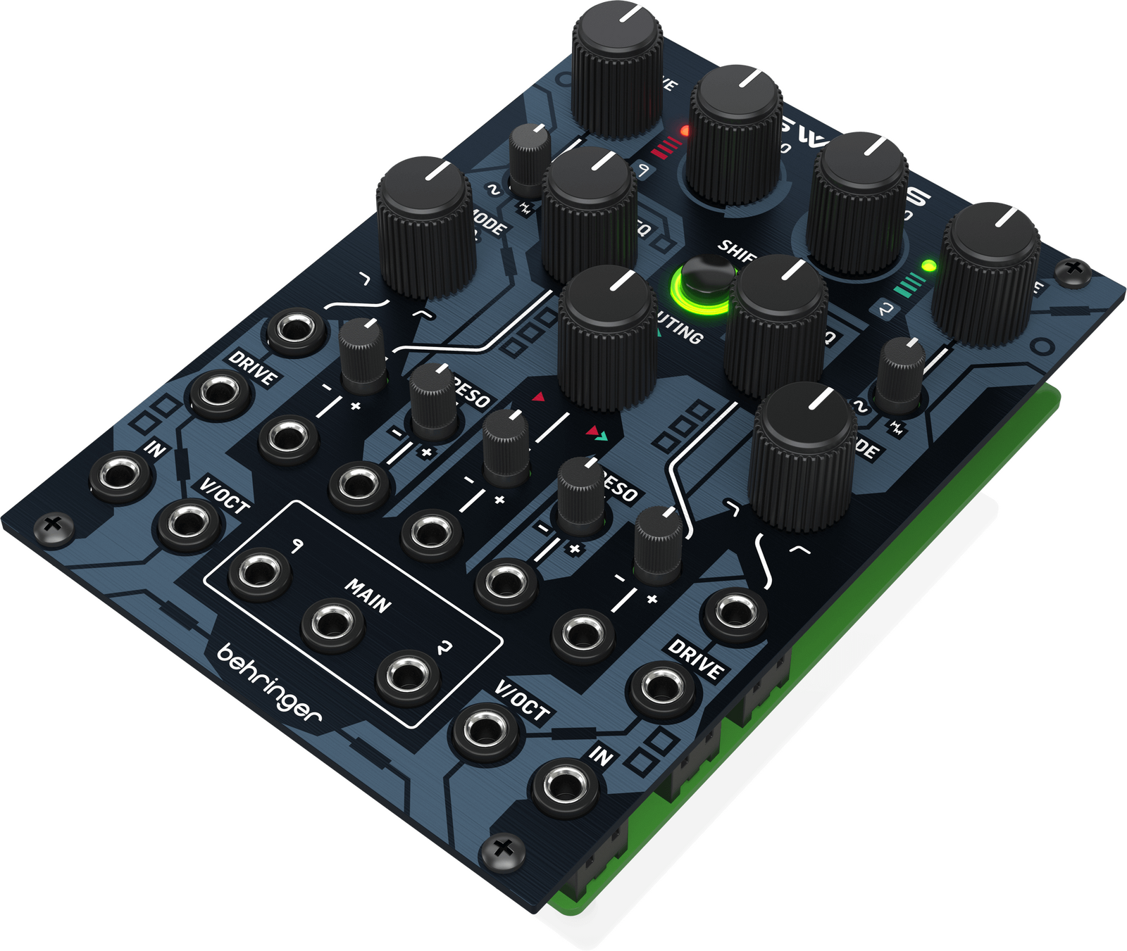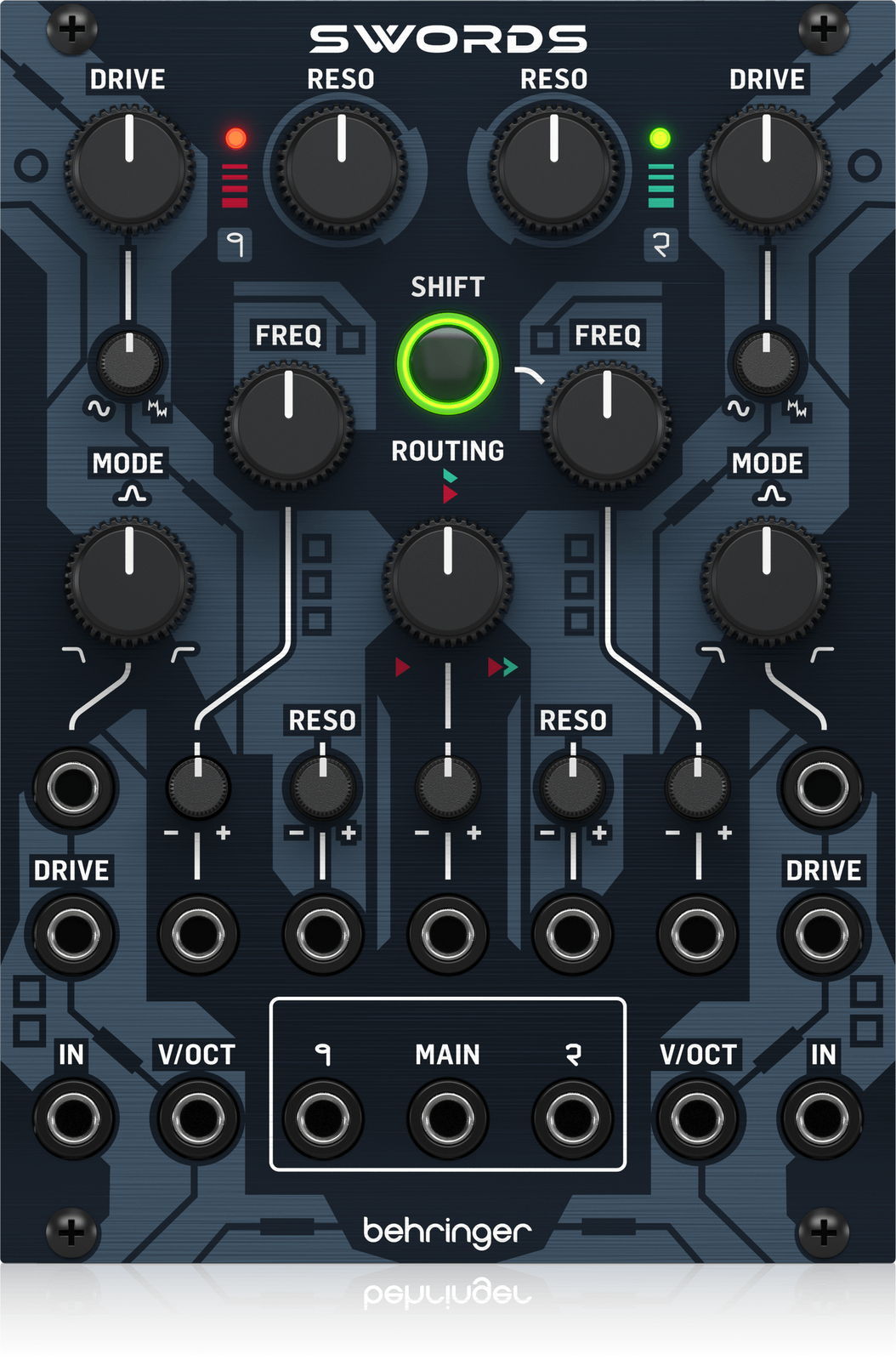 SWORDS is a dual analog multi-mode filter, complete with a drive circuit that controls the amount of gain and distortion of the input signal, which can be further varied from soft clipping to two-stage wave folding.