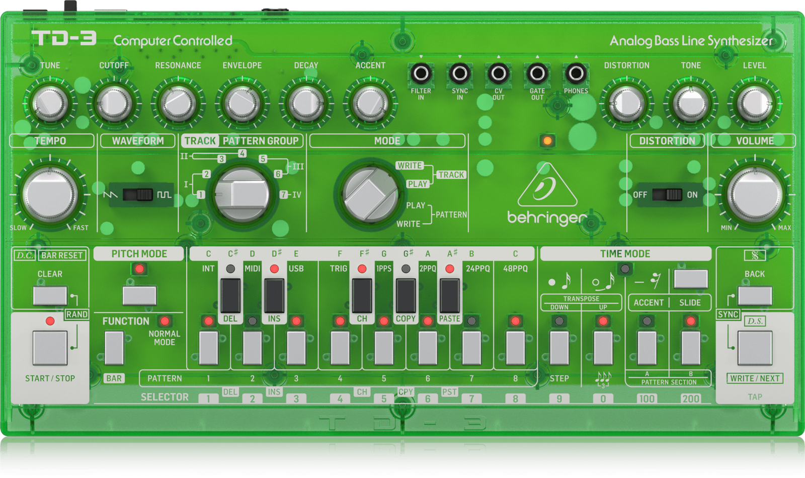 Amazing Bass Line synthesizer with true analog circuitry for bass and groove sounds, Authentic reproduction of original circuitry with matched transistors, Pure analog signal path based on legendary VCO, VCF and VCA designs, Sawtooth and square waveform VCO with transistor wave-shaping circuitry, Amazing 4-pole low-pass resonant filter with cut-off, resonance, envelope, decay and accent controls, Easy-to-use 16-step sequencer with 7 tracks, each with 250 user patterns, Arpeggiator with wide patterns for great sound effects, Distortion circuitry modelled after the DS-1* adds insane spice and edge to your sounds, 16-voice Poly Chain allows combining multiple synthesizers for up to 16 voice polyphony, 11 controls and 28 switches to give you direct and real-time access to all important parameters, MIDI and USB implementation with MIDI channel and Voice Priority selection.