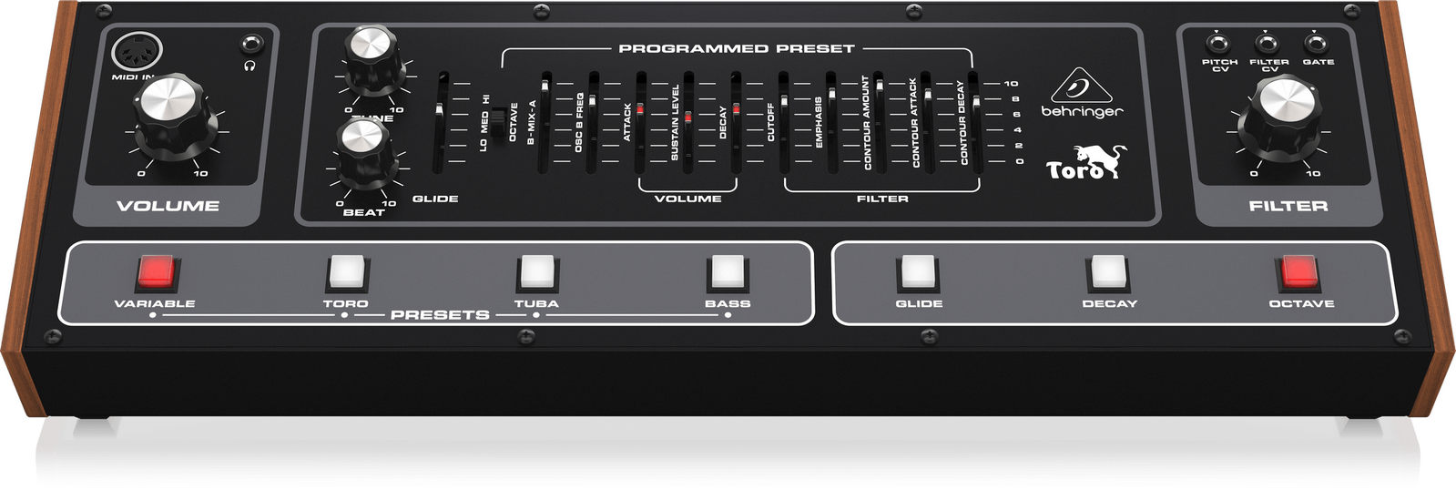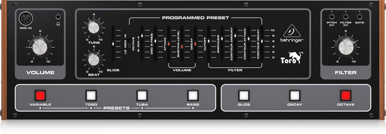 The TORO comes with 4 sound presets starting with the classic Toro, Tuba and Bass presets which have been carefully recreated to sound just like the original as well as Variable, which gives you access to all controls so you can shape and fine tune your sound.