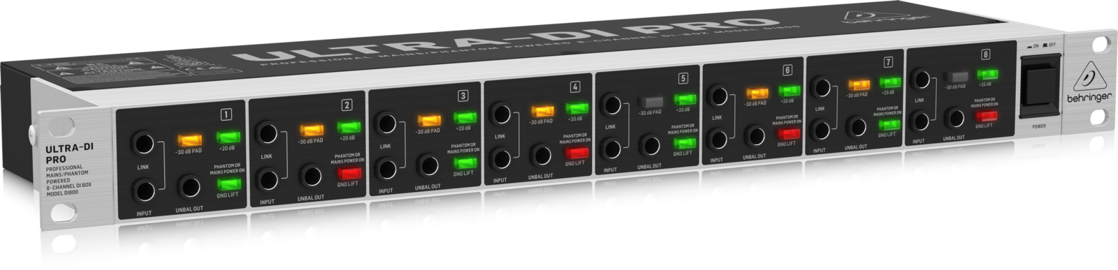 The ULTRA-DI PRO DI800 is a professional mains/phantom powered 8-channel active DI-box. If you need a rack-mountable DI unit with enough inputs to accommodate everyone on stage, or in the studio – then you need to plug into the DI800!