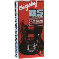 The B5™, sometimes referred as the Bigsby "horseshoe" is designed for flat top solid body guitars and includes a tension bar to increase the break angle over the bridge. Attaching via four screws to a guitar's top, the B5 is extremely versatile. B5s are common on many styles of guitars including Gibson SG™, Les Paul™ Special, Rickenbacker® 325, and Fender Telecaster®.