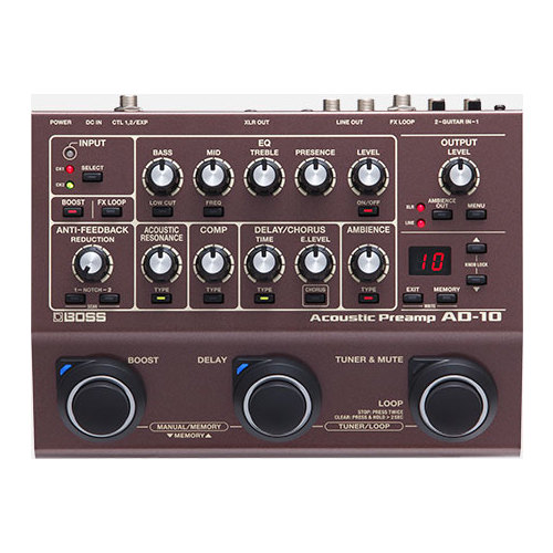 With its advanced BOSS technologies and comprehensive design approach, the AD-10 is a dream come true for serious acoustic players who are constantly striving for the very best sound reproduction. Its vast tone-shaping features and intuitive, hands-on controls enable anyone to dial in exceptional sounds quickly and easily. Advanced feedback-fighting capabilities are also on board, making it simple to tackle the sound issues that inevitably come up in different performance venues. And with 10 onboard memories, it’s possible to save favorite setups for different instruments and songs. The AD-10 also supports power via an included AC adapter or batteries, offering great flexibility for any performing situation.