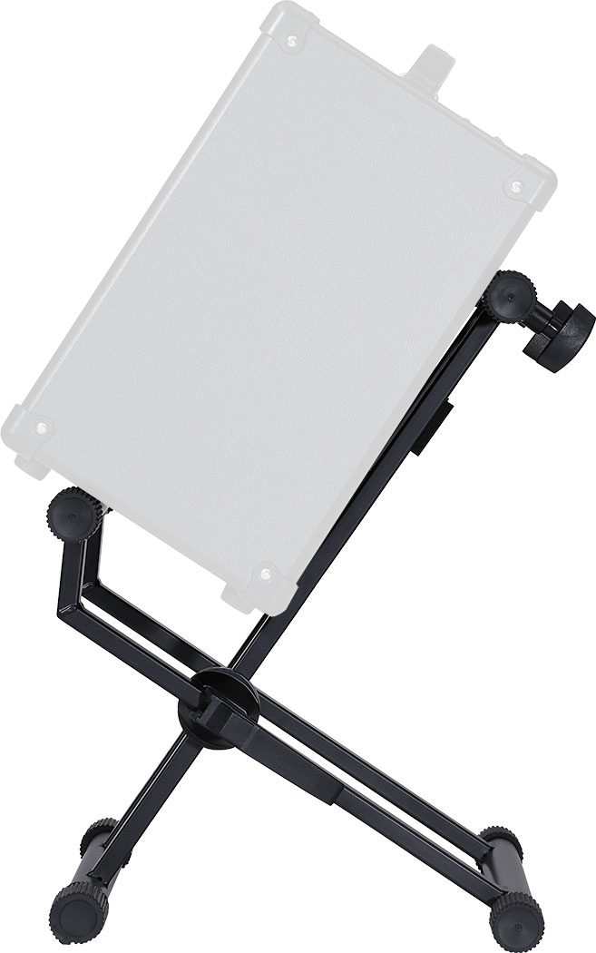 The BOSS BAS-1 Amplifier Stand cradles your favorite combo guitar amp at the perfect angle for monitoring and sound projection, whether at home, on stage, or in the studio. Constructed with heavy-duty steel for long-lasting durability, the BAS-1 features an adjustable tilt-back design and a telescoping support arm that accommodates a variety of cabinet widths. The stand collapses for easy travel, with a locking cam and quick-release lever for fast set up and tear down. And with adjustable feet, you can achieve wobble-free stability when using the BAS-1 on slightly uneven surfaces.
