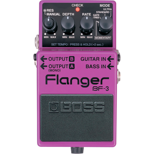 Building on the 20-year legacy of the famous BOSS BF-2, the new BF-3 flanger pedal gives guitarists and bassists an updated version of the classic BOSS flanger with the thickest stereo flanging sounds ever. Two new modes (Ultra and Gate/Pan) create stereo flanging with incredible depth--even Slicer-type effects and sounds that seem to "swirl" around the listener. An instant classic.