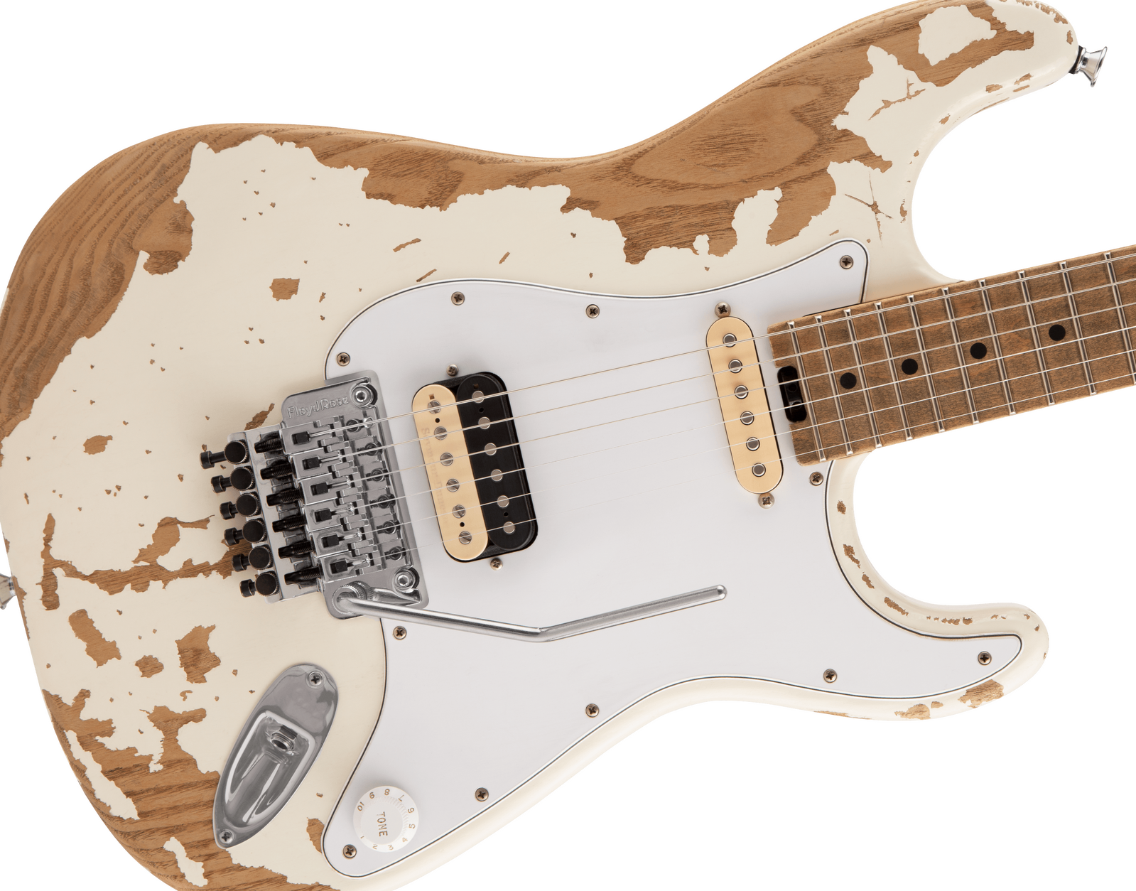 The single white Strat®-style skirt volume knob (labeled as "Tone") houses a push/push selector for switching between the bridge and neck pickups, while a top-mount Floyd Rose® 1000 Series double-locking tremolo bridge system keeps this axe in tune through endless dive bombs and the most brutal riffs.