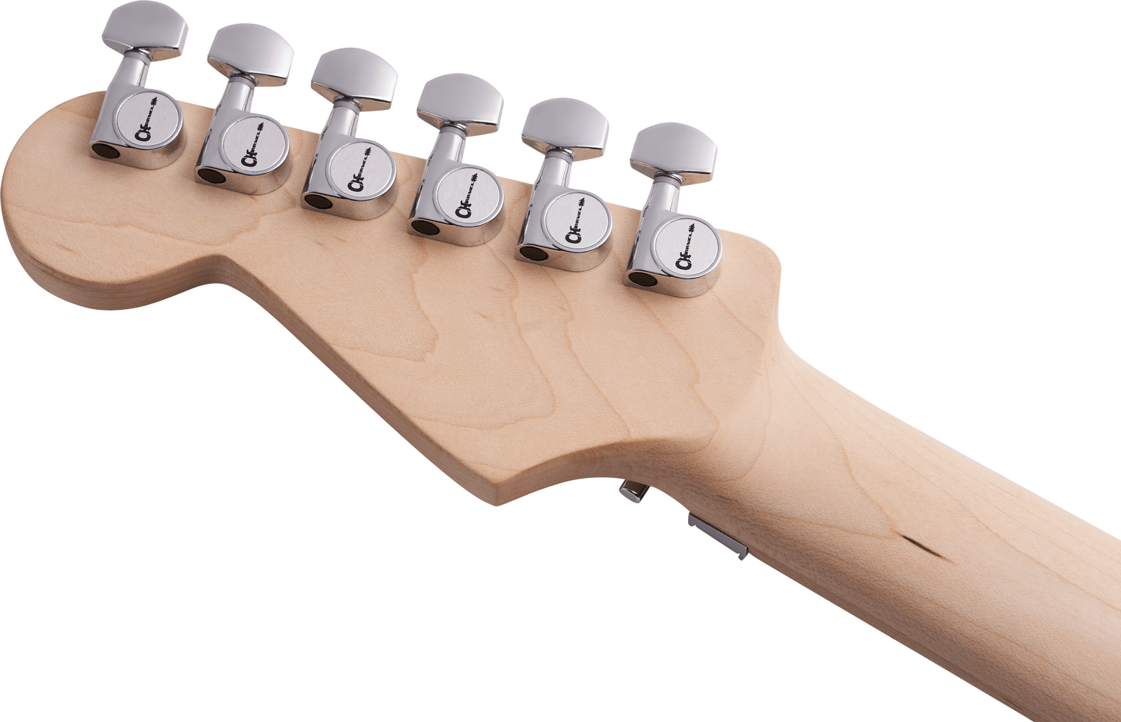 Charvel®-branded sealed die-cast tuners, Charvel neck plate and standard strap buttons