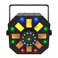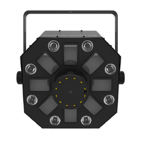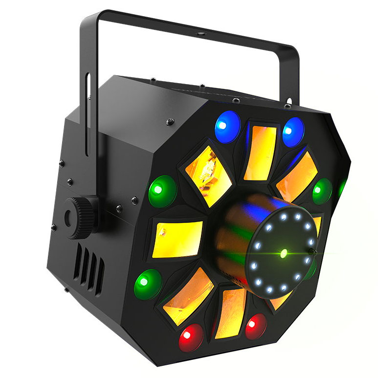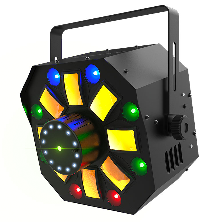 4-in-1 LED light that combines an RGBAW rotating derby, RGB+UV wash, red/green laser, and a ring of white SMD strobes