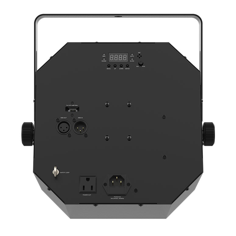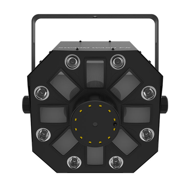 Dynamic lighting thrills are at hand with Swarm Wash FX ILS, a 4-in-1 LED light that combines an RGBAW rotating derby, RGB+UV wash, red/green laser, and a ring of white SMD strobes. Imagine red and green laser beams projecting thousands of beams and built-in, eye-catching automatic and sound- activated programs that are easy to generate. It’s all the reality of Swarm Wash FX ILS. But the punch this powerful party light packs is its compatibility with the cutting-edge Integrated Lighting System (ILS) that makes creating coordinated light shows across different fixture types easy. Swarm Wash FX ILS is also D-Fi USB compatible for use with the wireless ILS connection, and wireless Master/Slave or DMX control. Access built-in automated programs via IRC6 remote, Master/Slave or DMX.