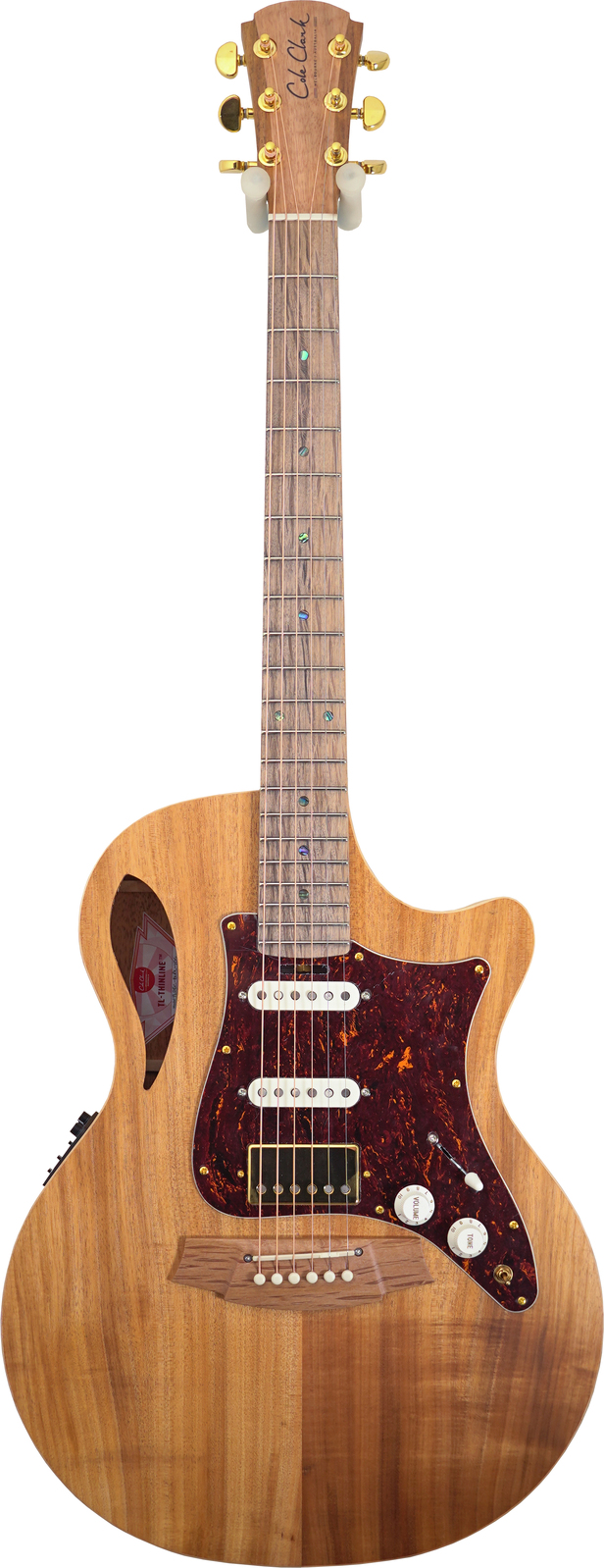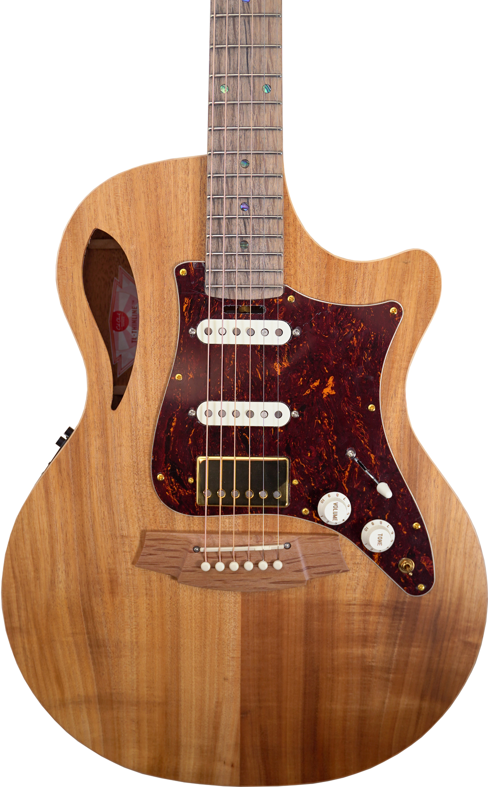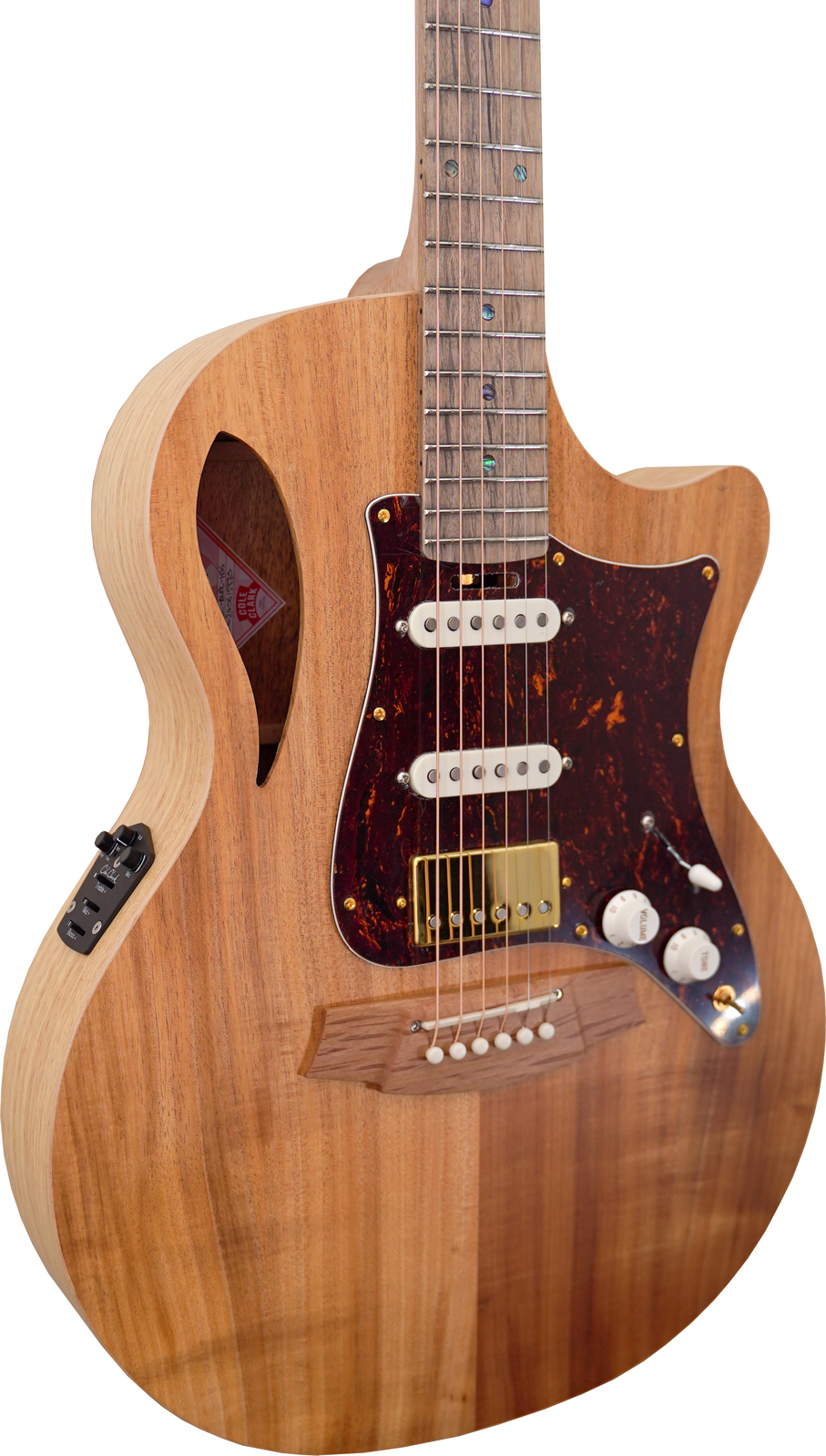 All solid timber cutaway True Hybrid Thinline Grand Auditorium with F.E.A internal bracing.