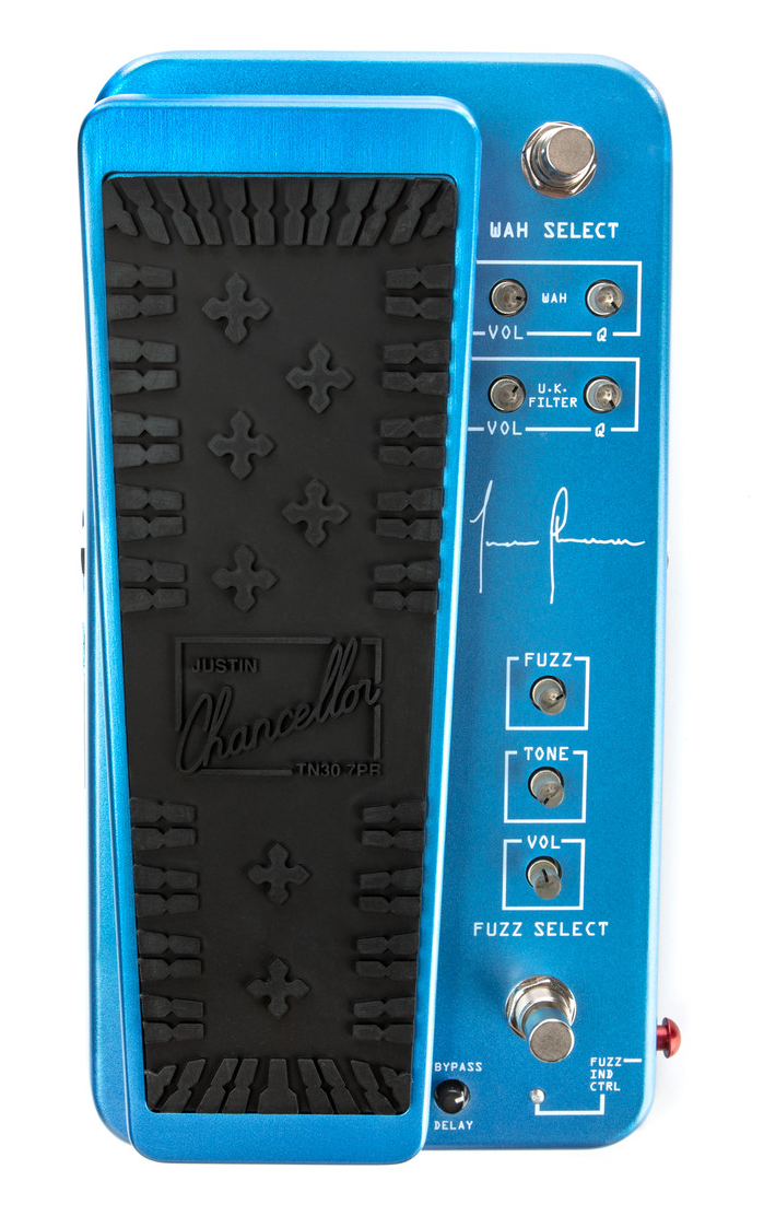 The Justin Chancellor Cry Baby Wah is a multi-tool of sonic craftsmanship, combining three separate effects into a single pedal: the fluid expressiveness of a custom midrange filter, the bright aggression of a custom wah circuit, and the chainsaw grind of a vintage fuzz. It's the perfect complement to bass player Justin Chancellor's multi-dimensional role in the band Tool. Whether opening up soundscapes with chords and harmonics or syncing up with guitarist Adam Jones to perform arresting single-note unison runs, Justin goes above and beyond the traditional boundaries of his instrument to help compose the band's multi-layered tunes. He is, without a doubt, one of the modern pioneer users of effects on bass, and he keeps a carefully configured pedalboard at his disposal for crafting tones and exploring sounds. This custom Cry Baby Wah combines some of his favorite ways to do just that—filter, wah, and fuzz.