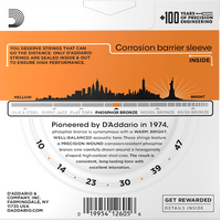Phosphor Bronze was introduced to string making by D'Addario in 1974 and has become synonymous with warm, bright, and well balanced acoustic tone. D'Addario Phosphor Bronze strings are precision wound with corrosion resistant phosphor bronze onto a carefully drawn, hexagonally shaped, high carbon steel core. The result is long lasting, bright sounding tone with excellent intonation.